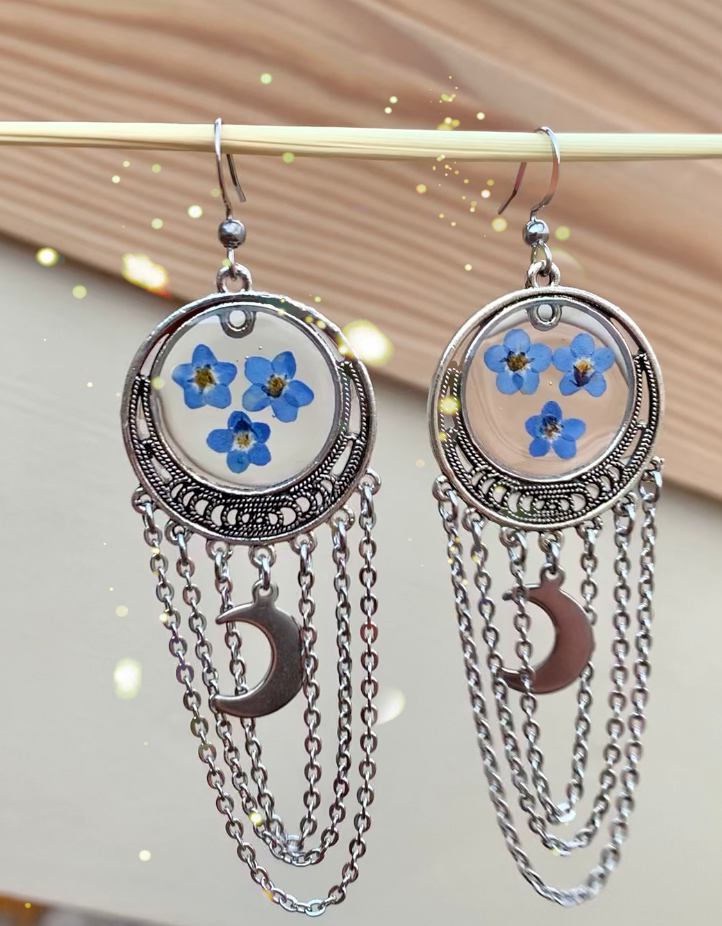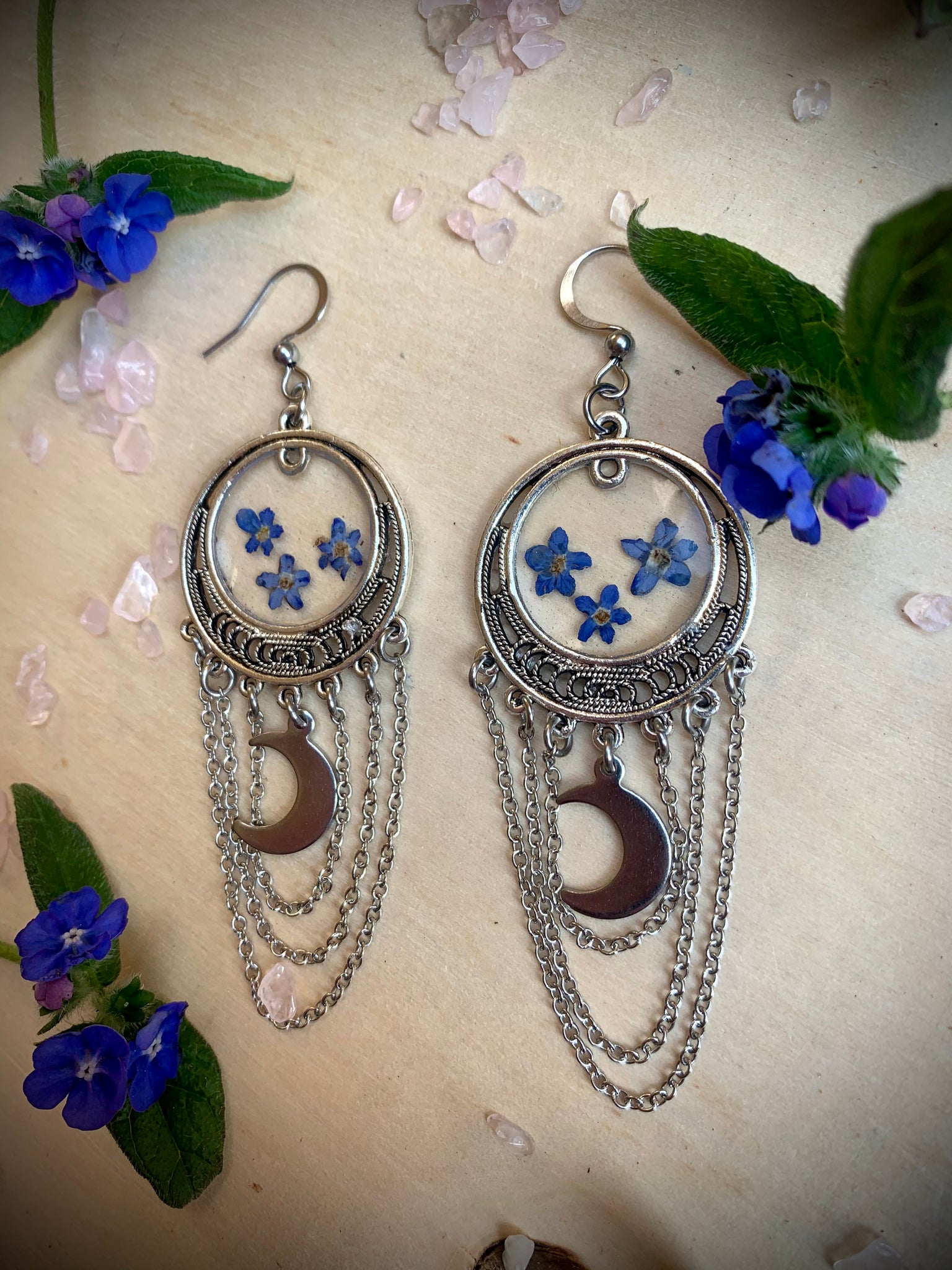 Forget Me Nots picked in Wicklow on a fresh spring morning, incapsulated in a boho frame with a steal moon charm and stainless steal chains.