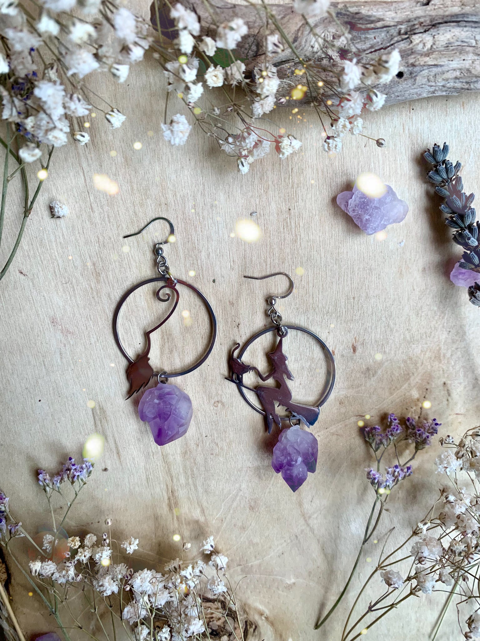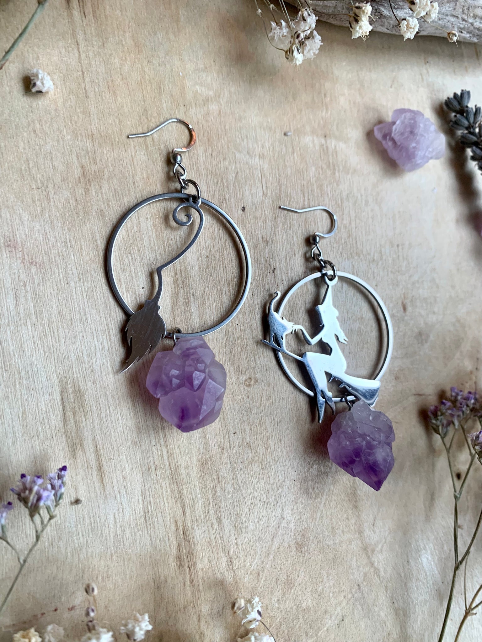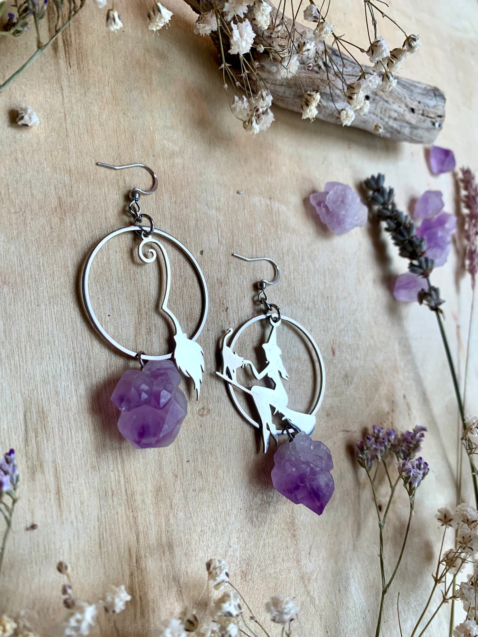 Stainless steel hooks with Witch/broom charm and a stunning Amethyst crystal.