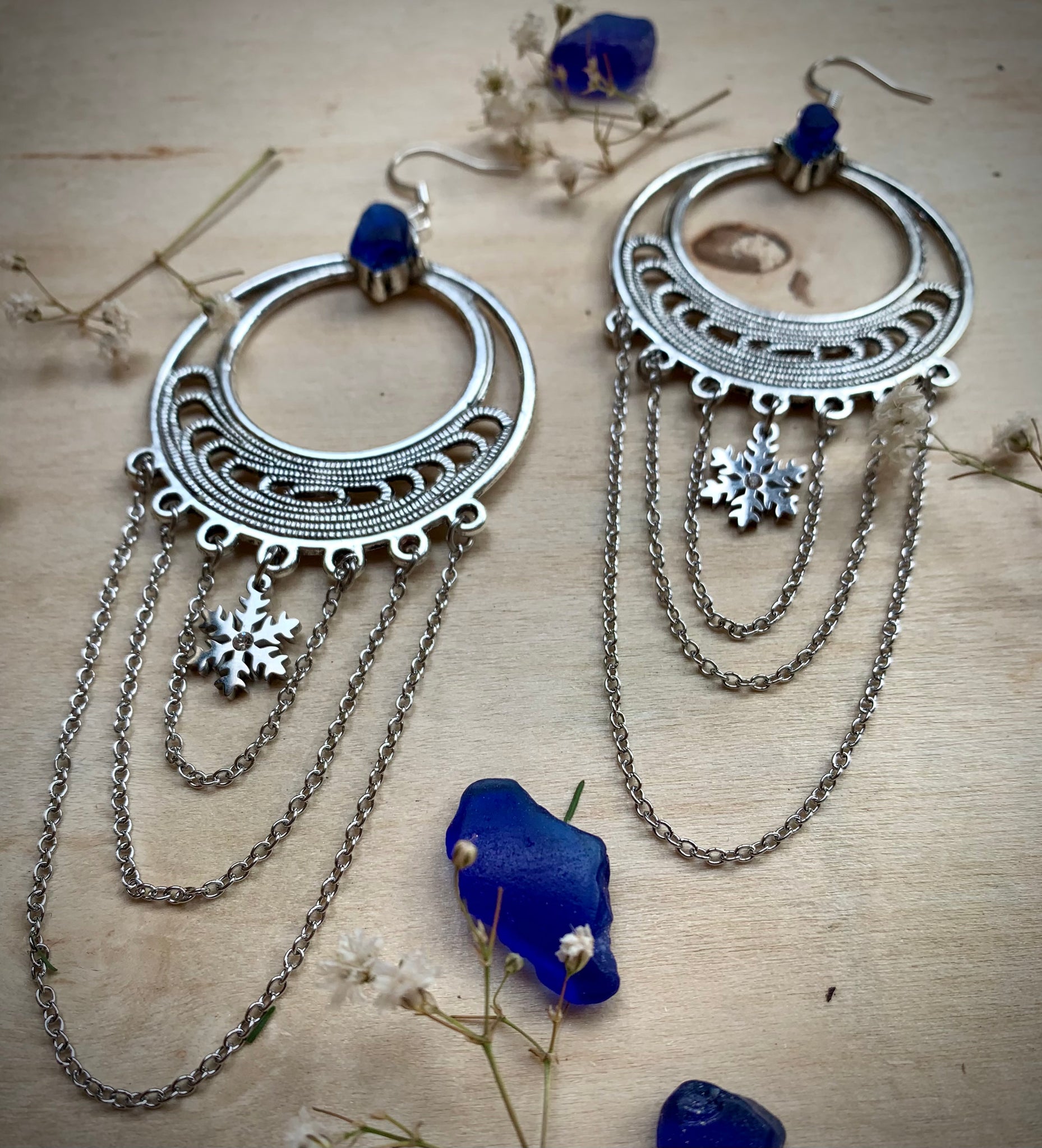 Cobalt blue sea glass, added chains and steal snowflake charm .