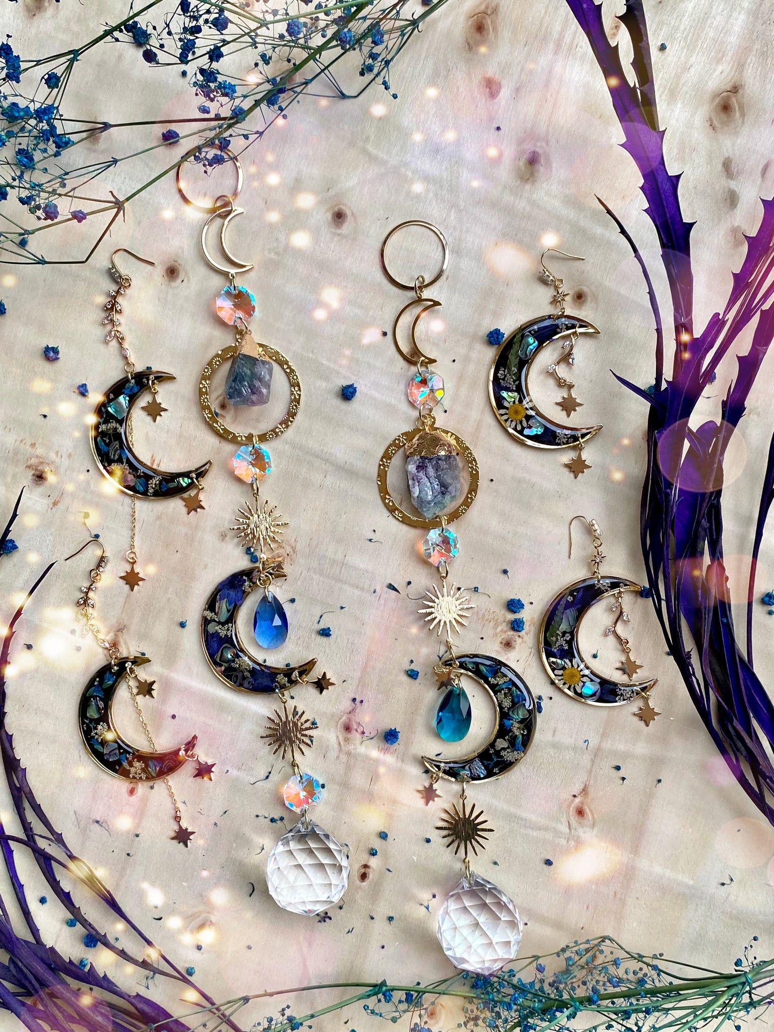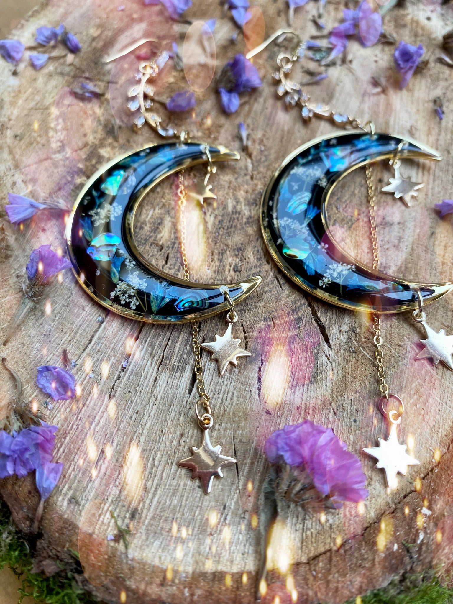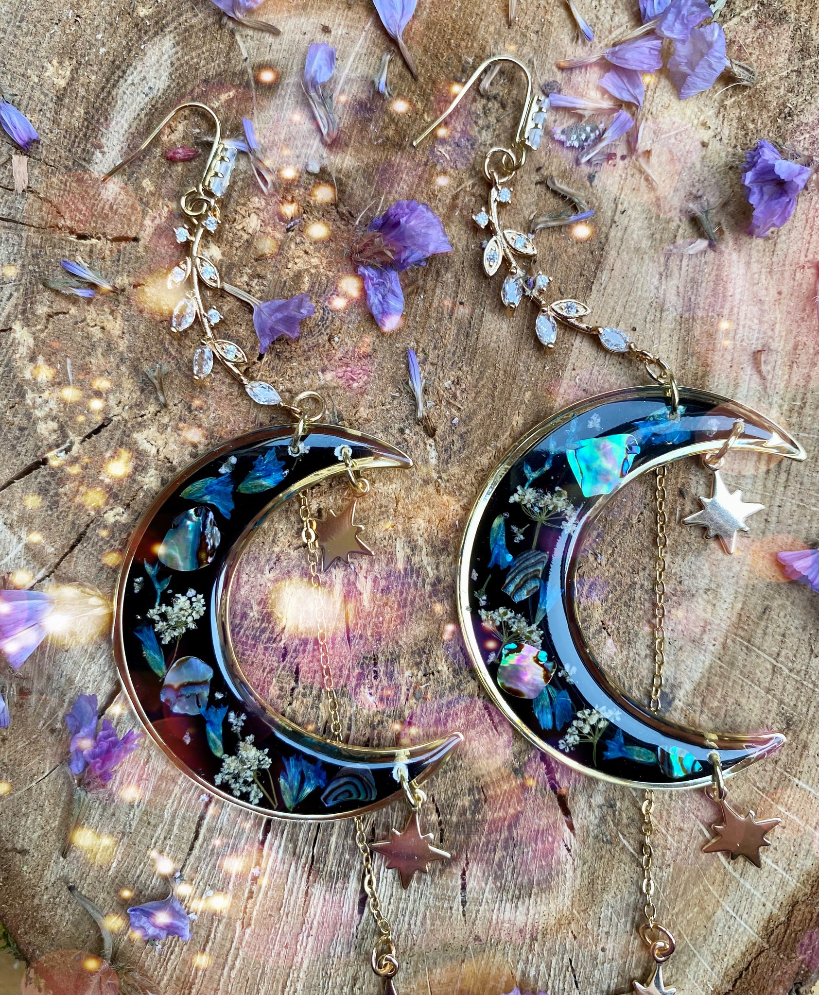 A magical handmade moon featuring vibrant abalone shell pieces with hand picked and preserved flowers.
