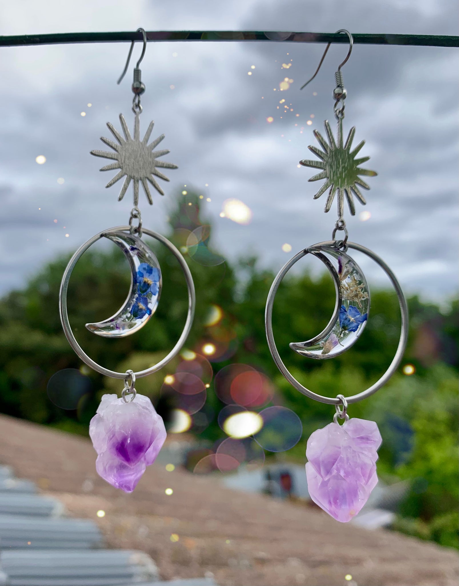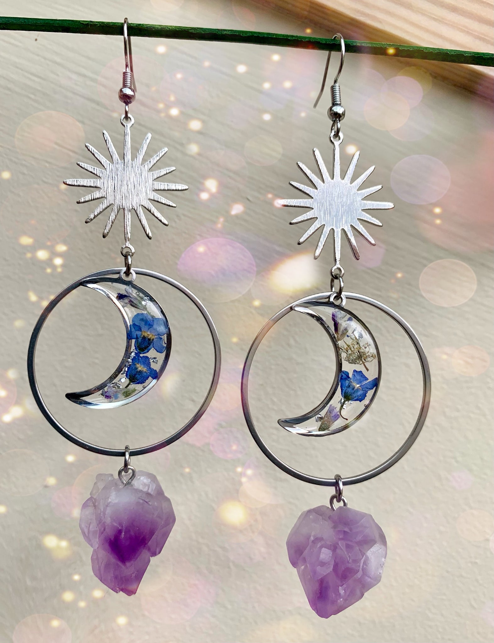 Celestial stainless steel earrings and beautiful healing amethyst crystals.