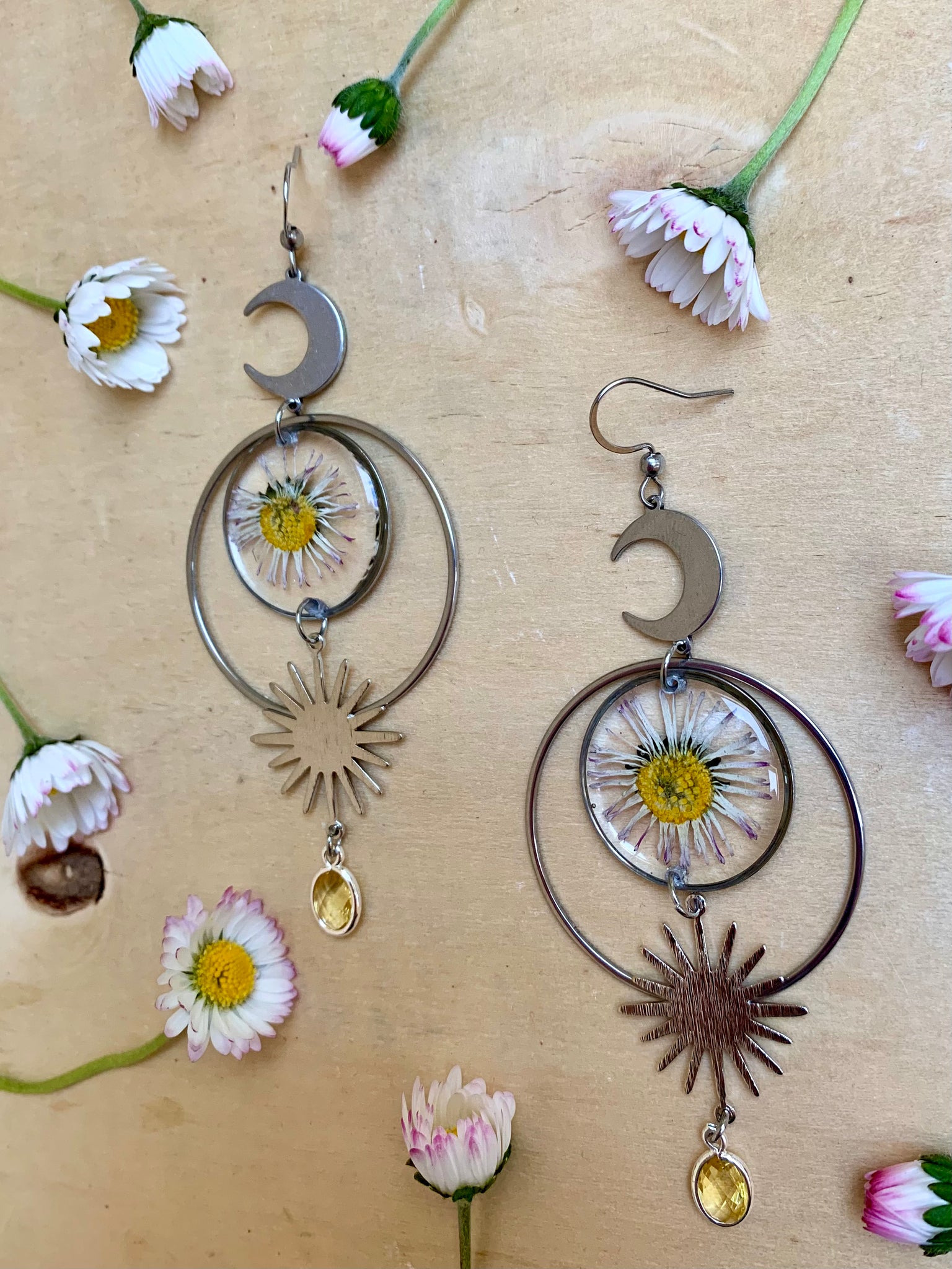 Stainless steel earrings and charms with real preserved Daisy flowers from Wicklow.