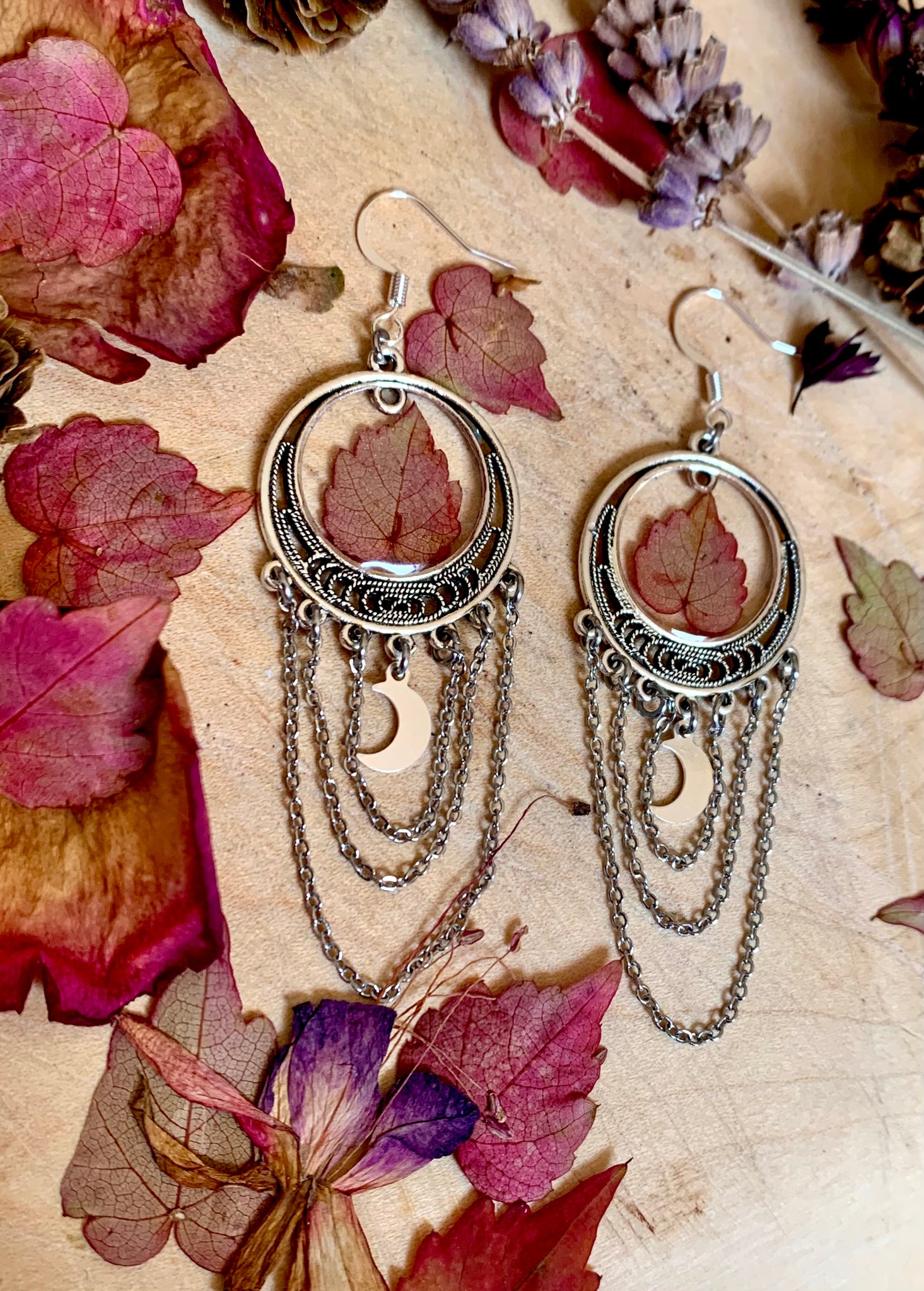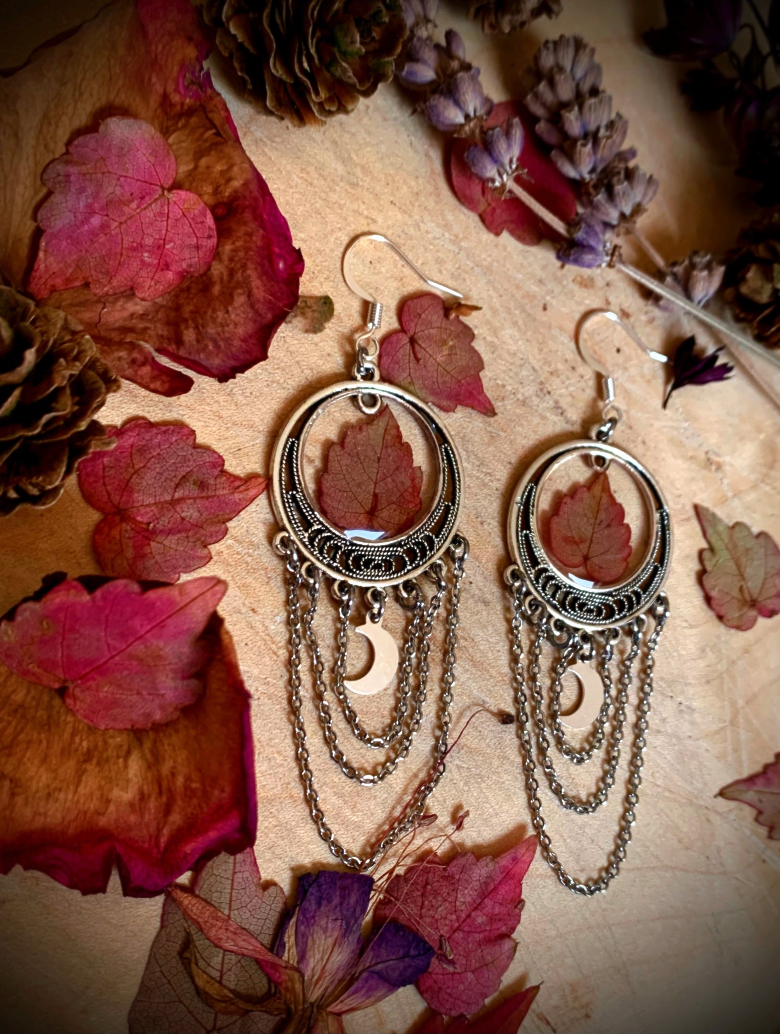 Autumn leaves picked in Wicklow, incapsulated in a boho frame with a sterling silver moon charm and stainless steal chains.