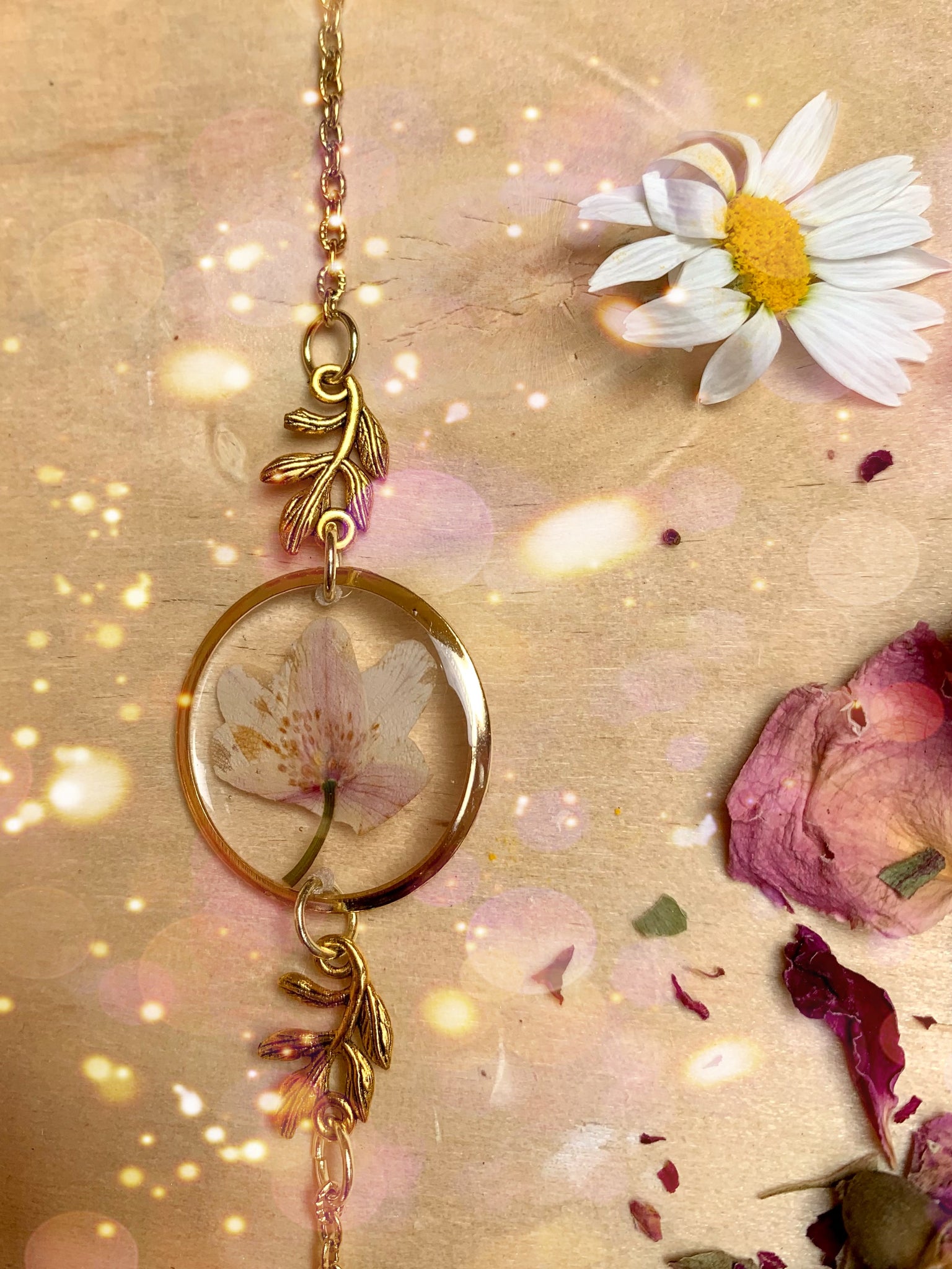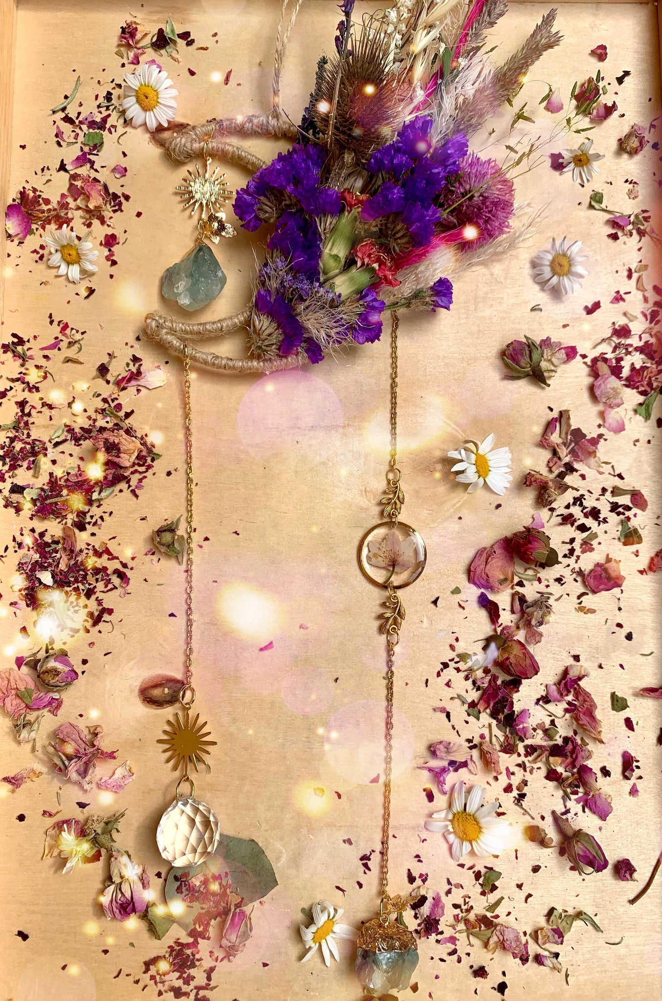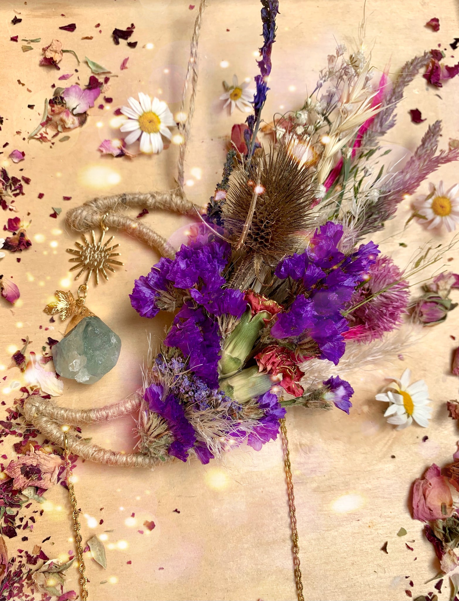 Real hand dried flowers, wild flower features charm and local teasel. Stunning healing Rainbow Fluorite crystals and light reflecting glass crystals set on a moon frame.
