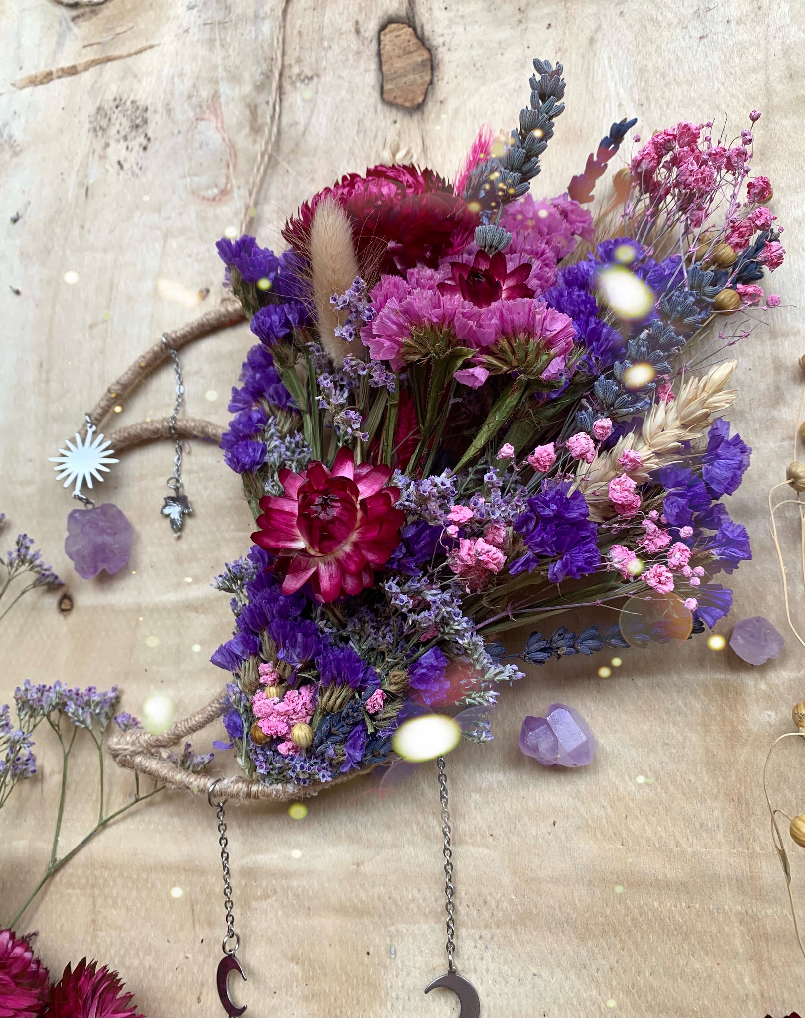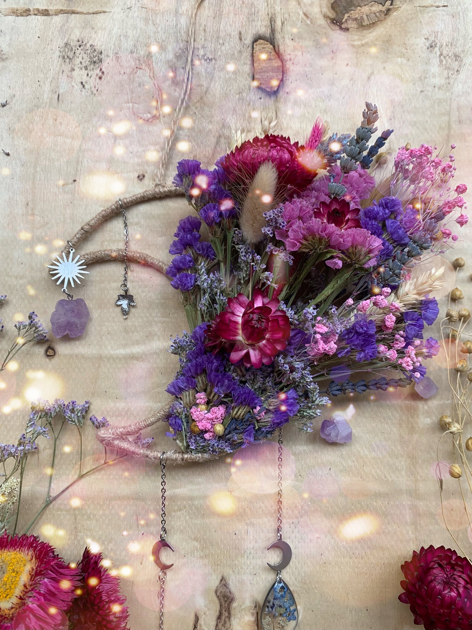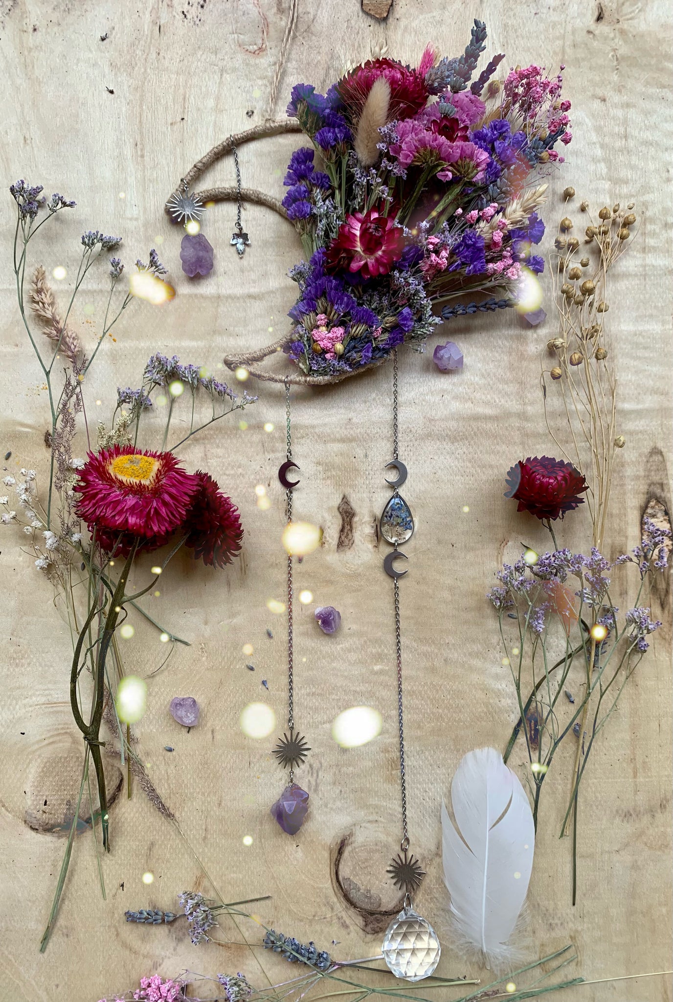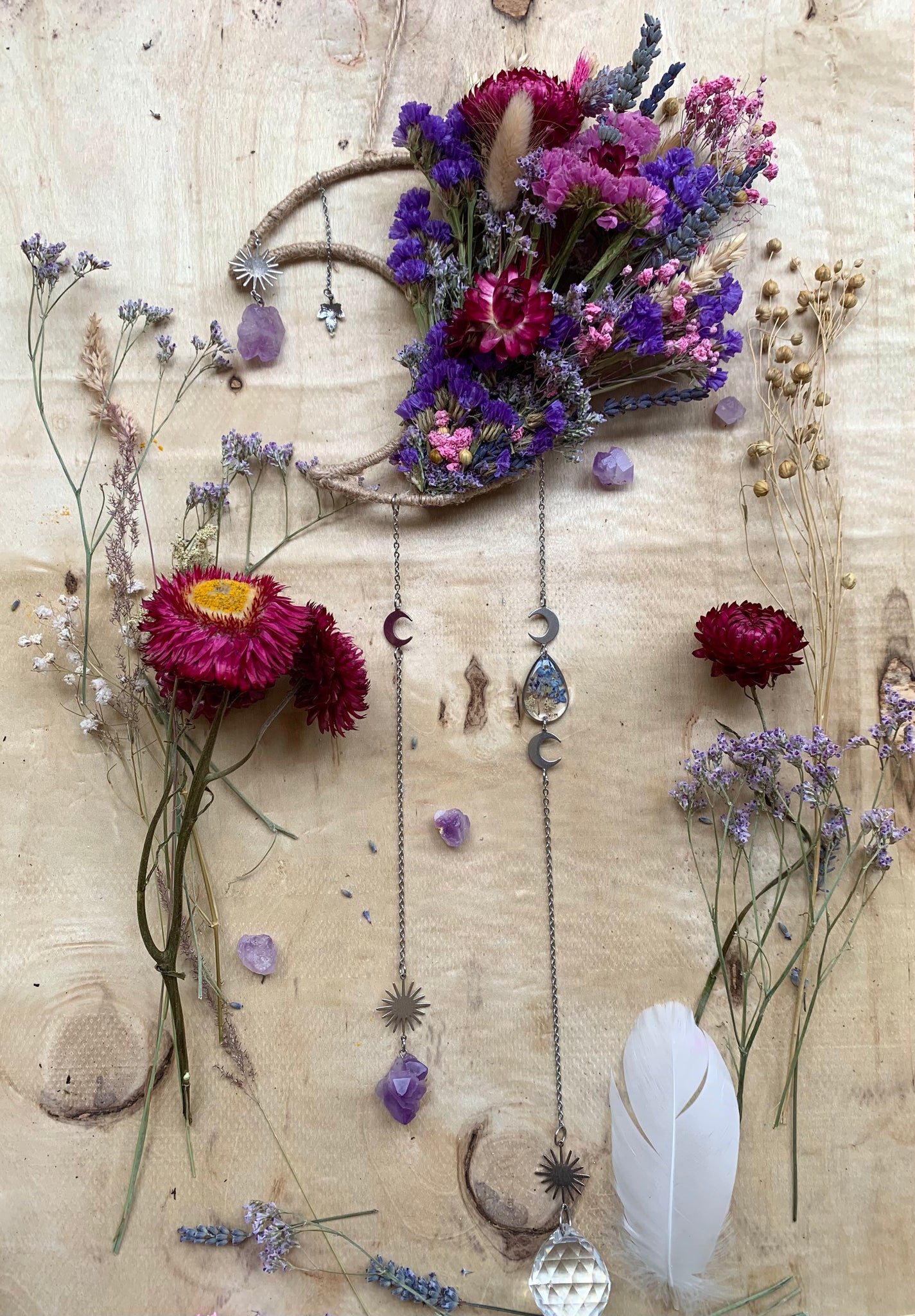 Real hand dried flowers,a handmade preserved Forget me not and wild flower charm. Stunning healing Amethyst crystals and light reflecting glass crystal set on a moon frame.
