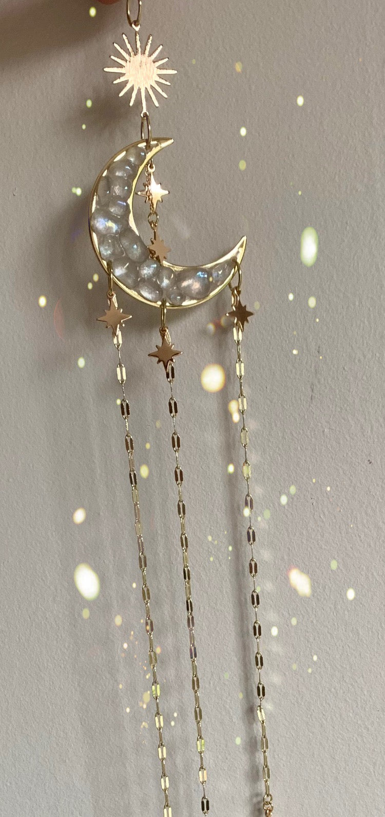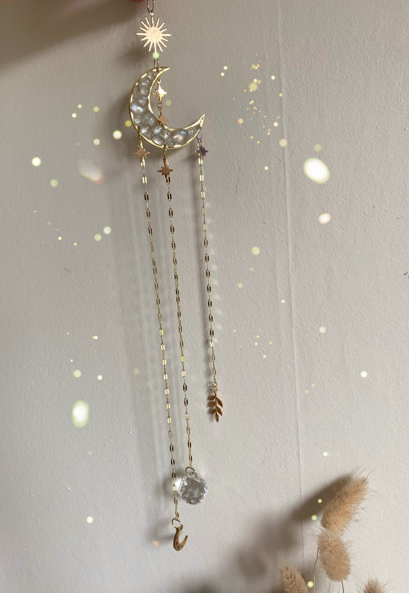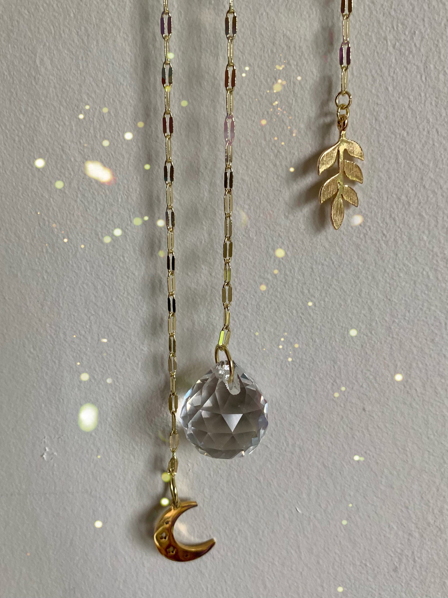 Tumbled Aura Quartz crystals set in a moon Bezel with a three point stars, chains, charms and crystal reflecting orb.
