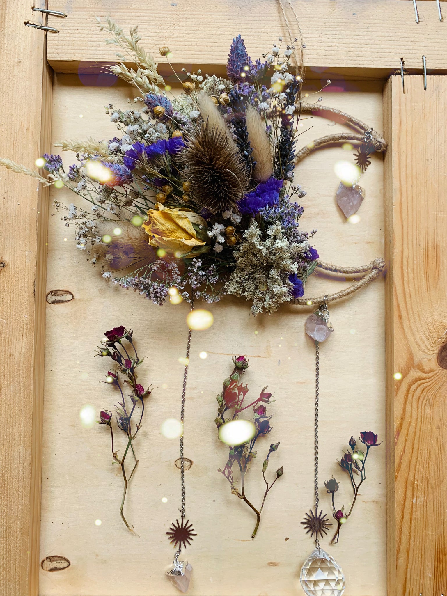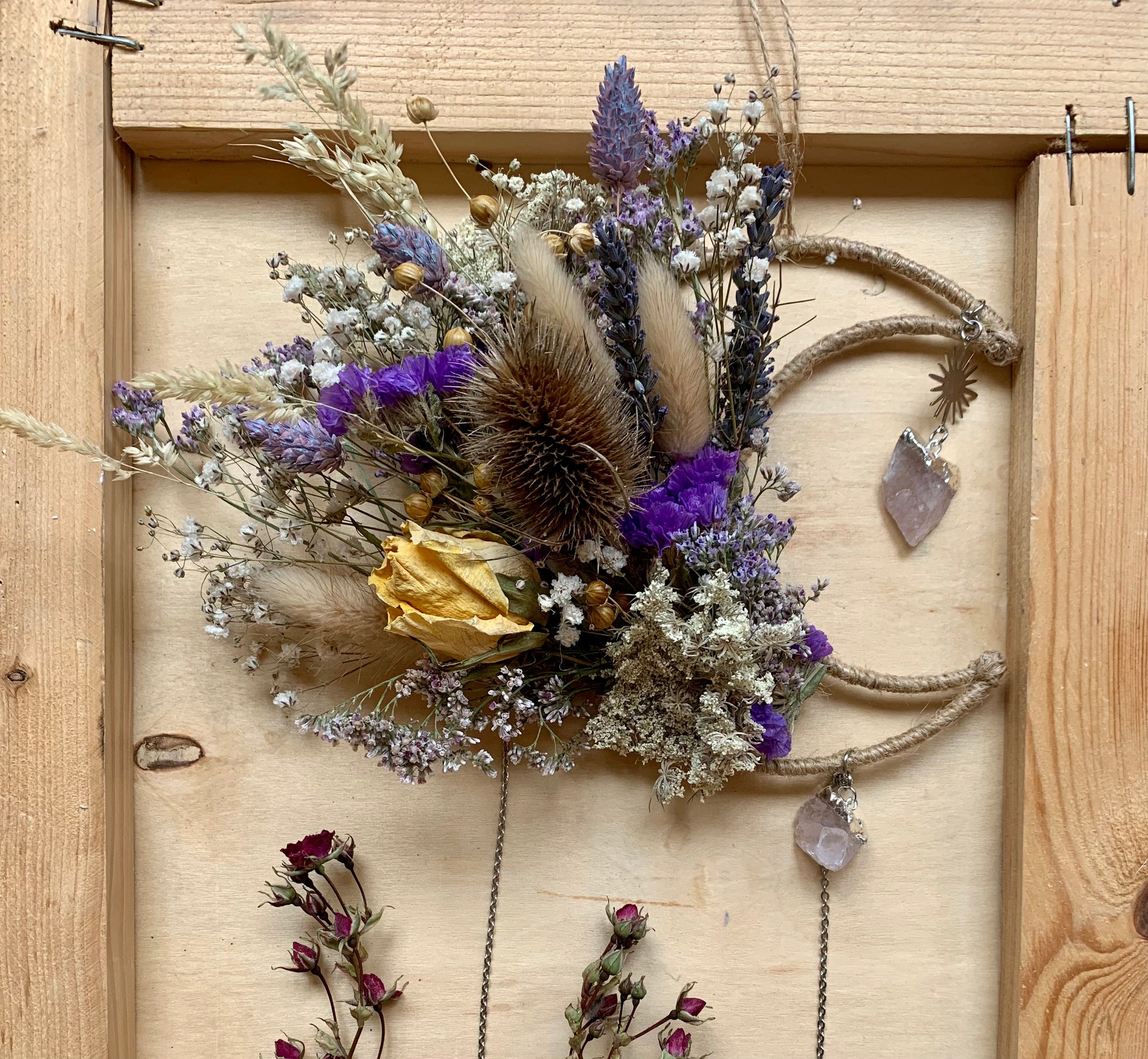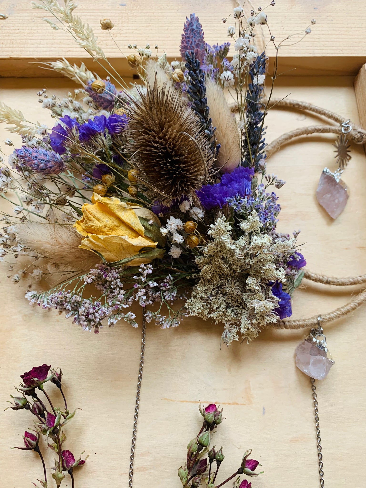 Real hand dried flowers and stunning Rose Quartz crystals.