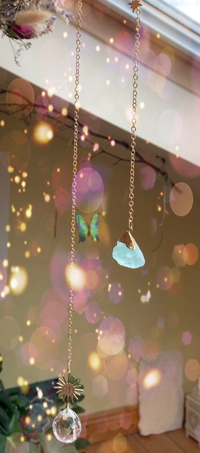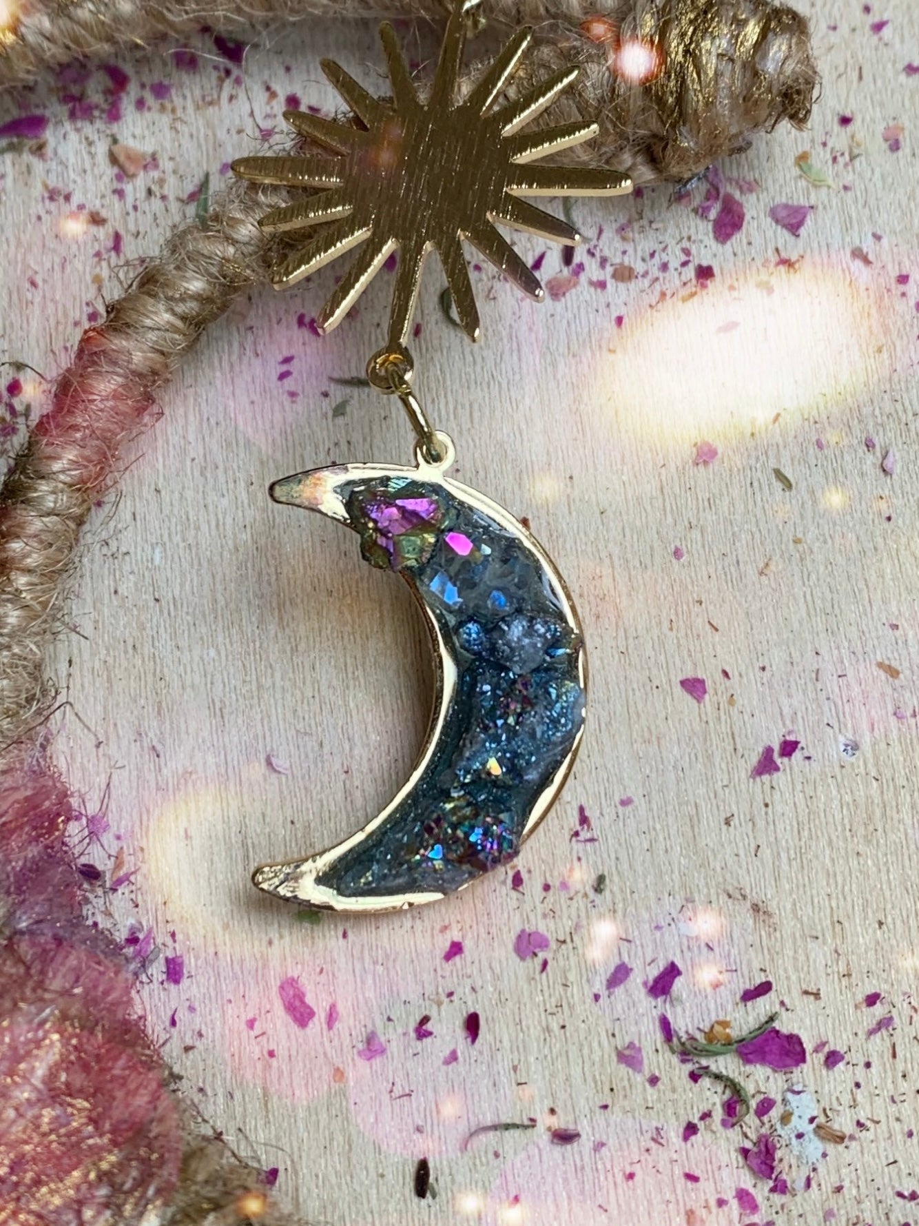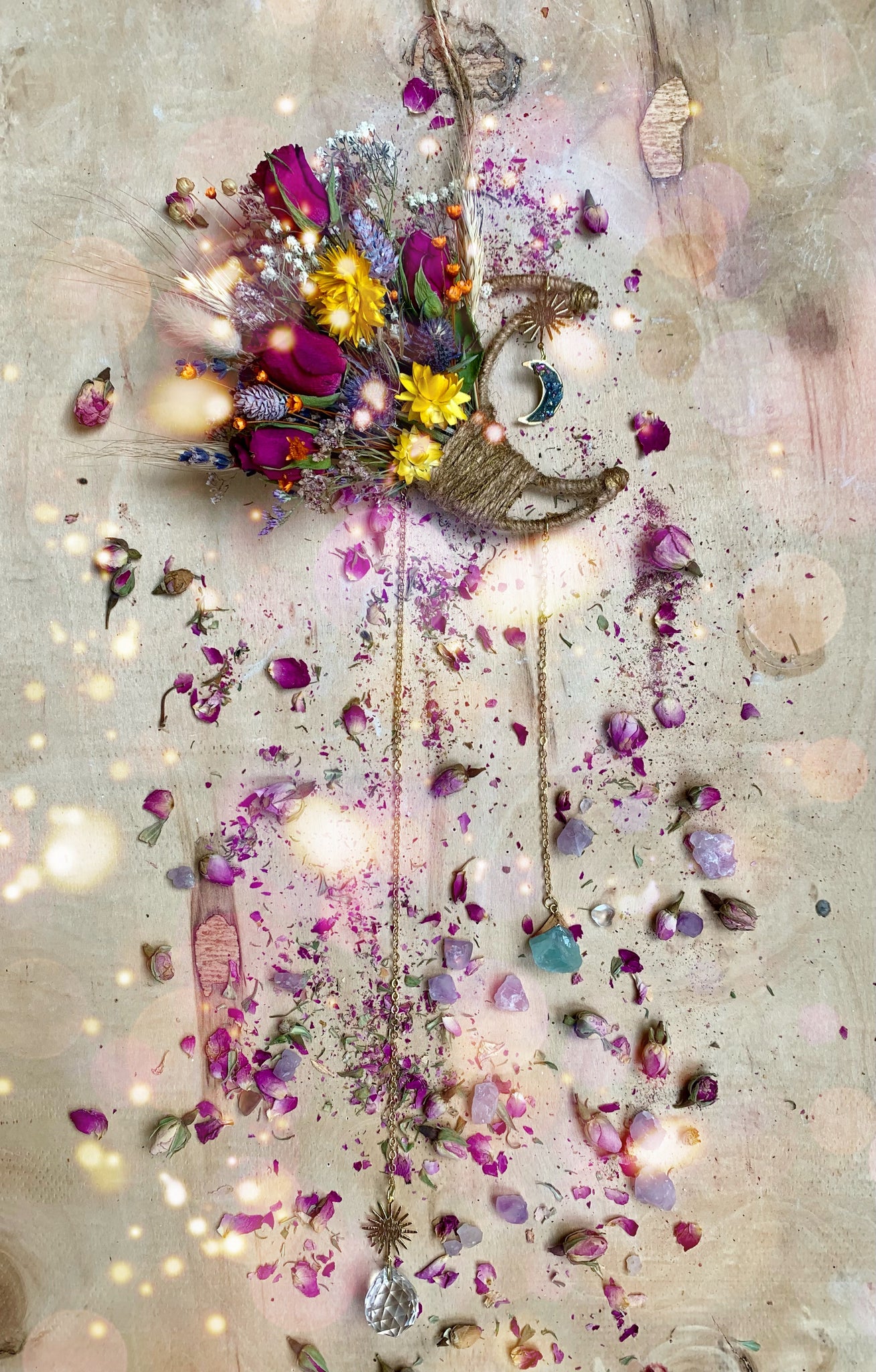 Real hand dried flowers and peacock ore crystal moon charm. Stunning healing Large rainbow fluorite crystal and light reflecting glass crystal set on a moon frame.