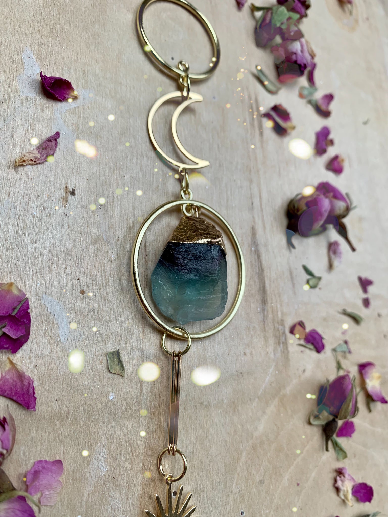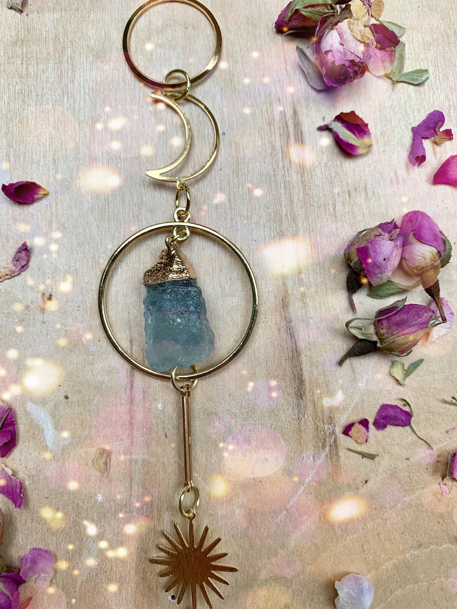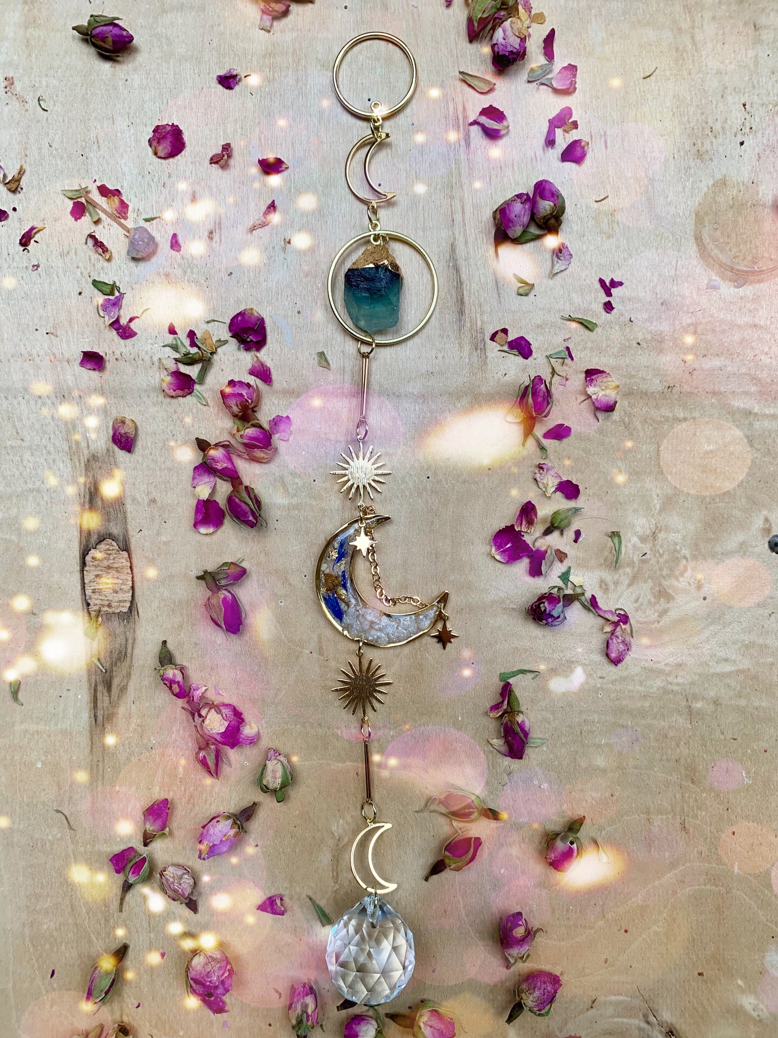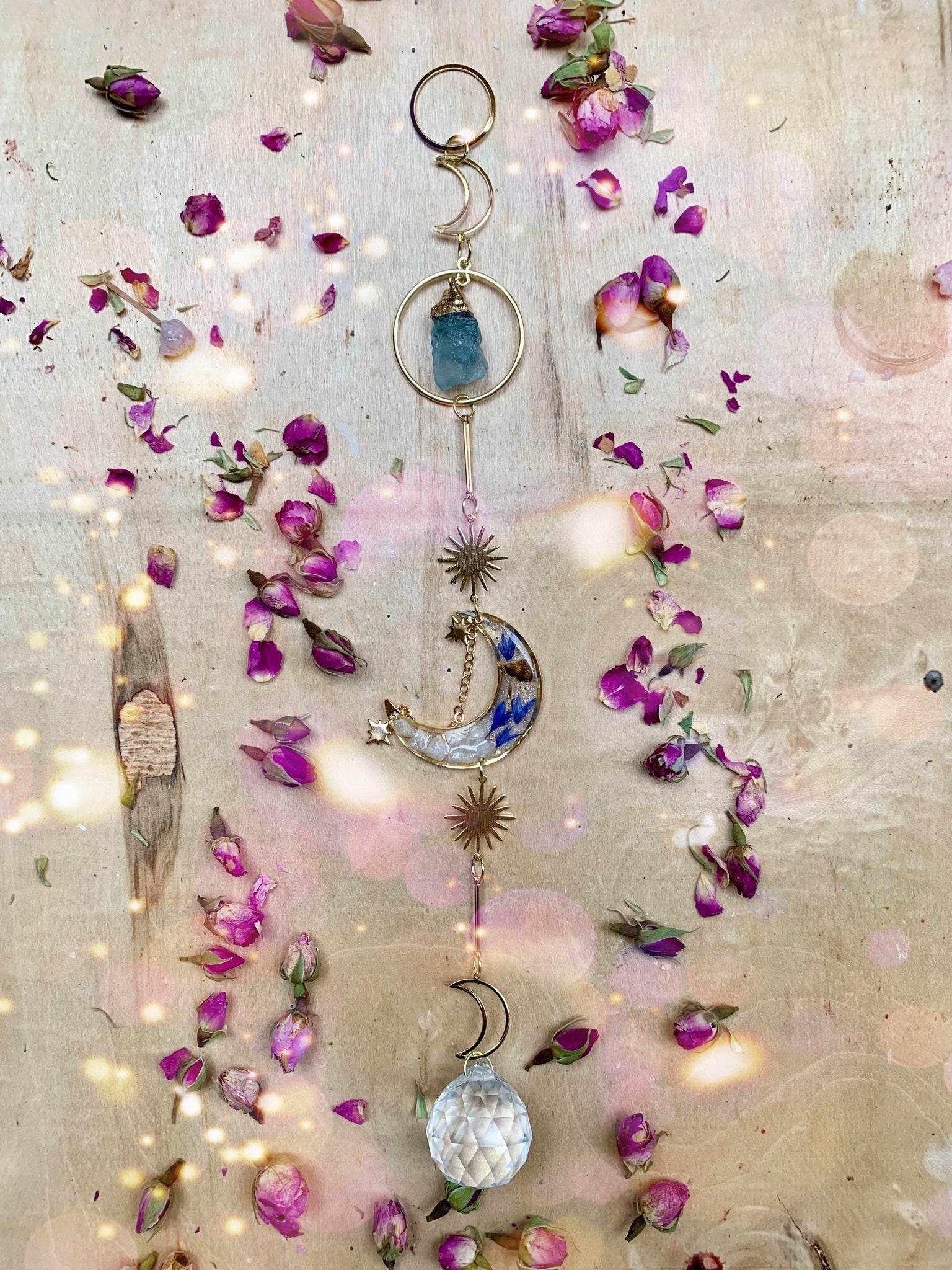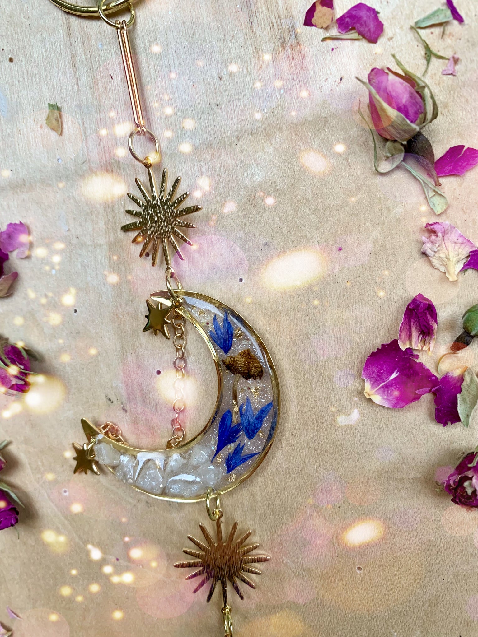 Set in resin, accompanied by gold leaf, blue corn flowers, queens Anne’s lace and Aura Angel Quartz crystal.