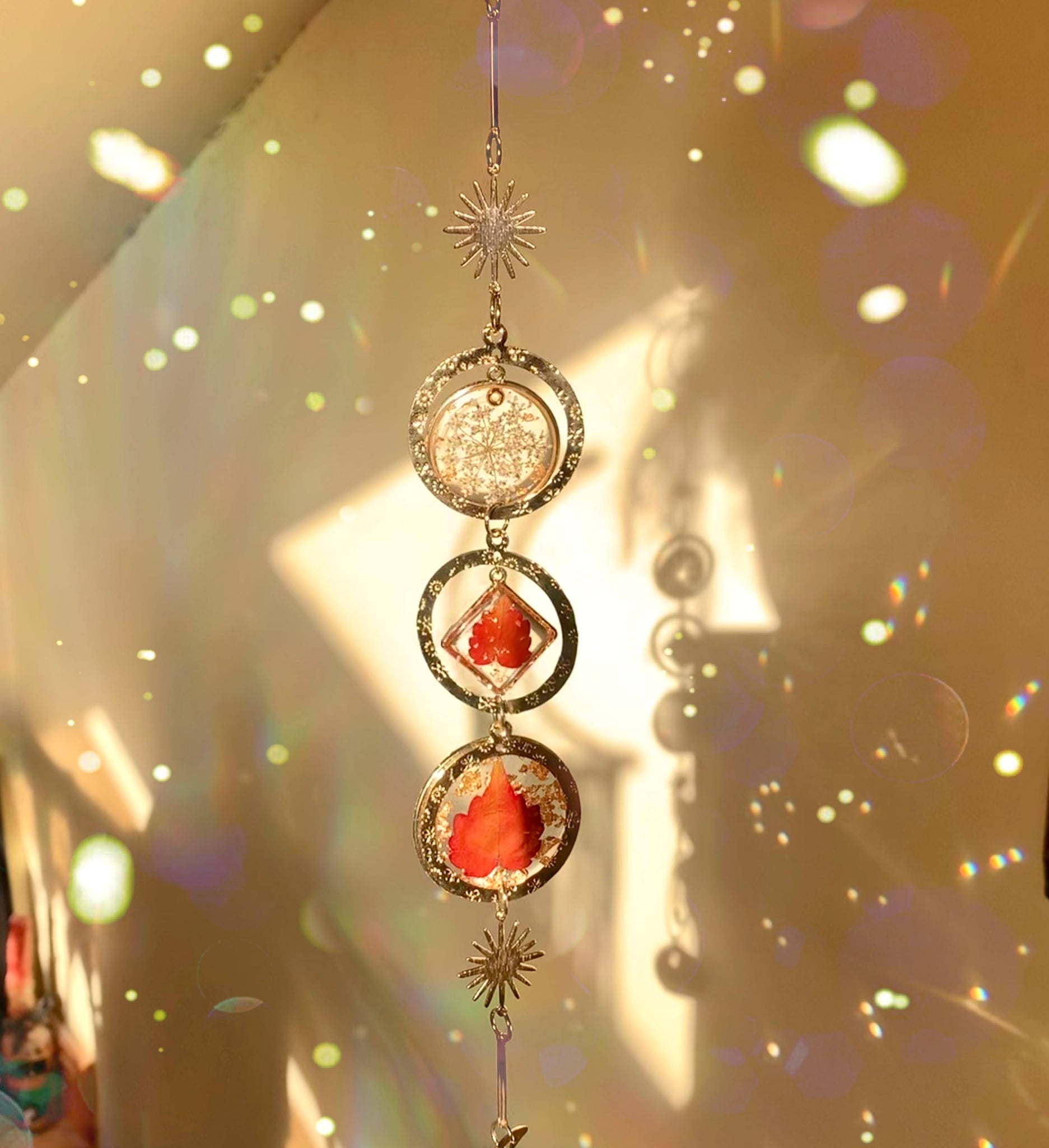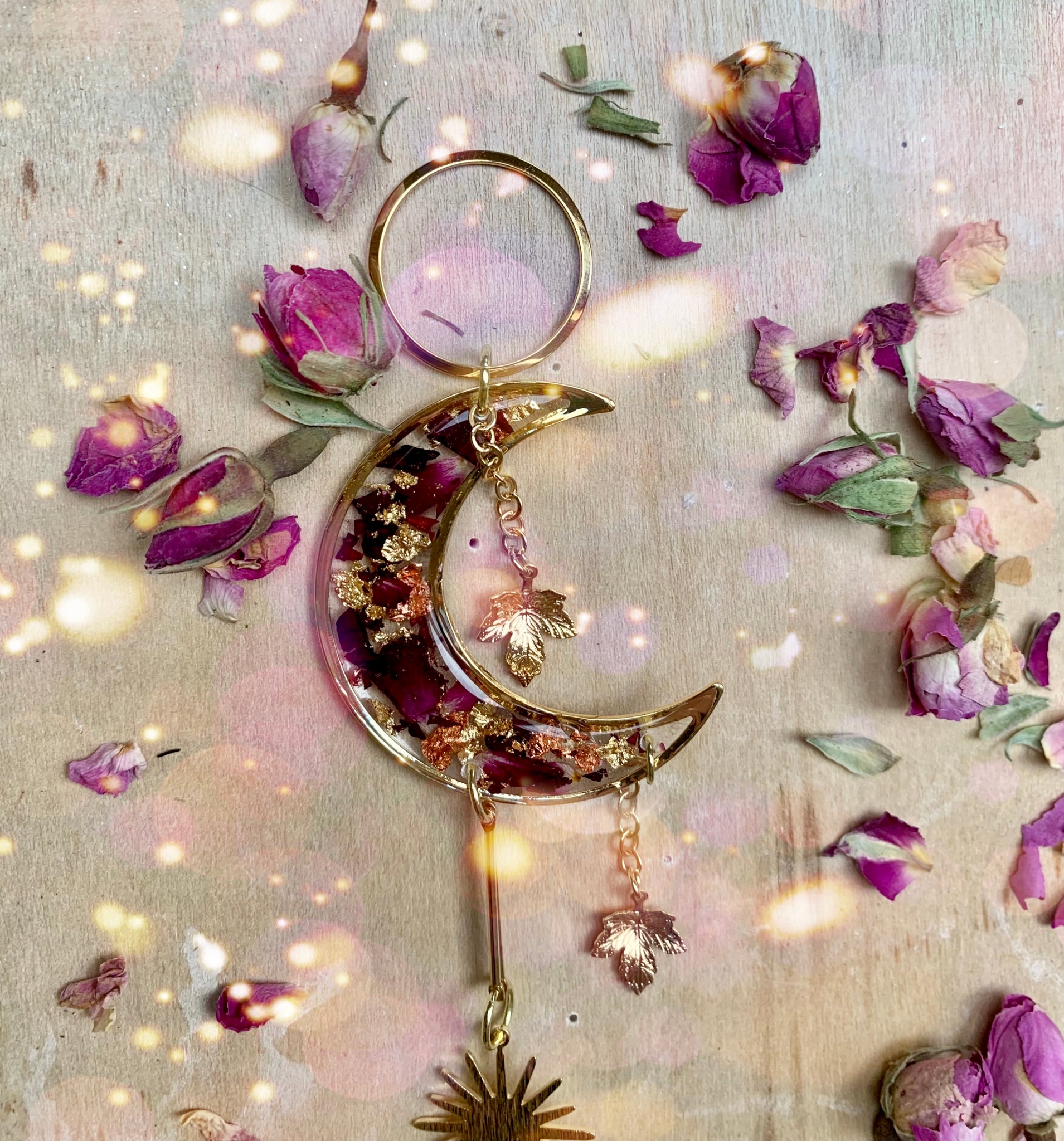 Real preserved Roses and autumn leafs grown from the Bosca Bandia garden, set in resin with gold leaf and gold plated charms. Light reflecting glass crystal ball.