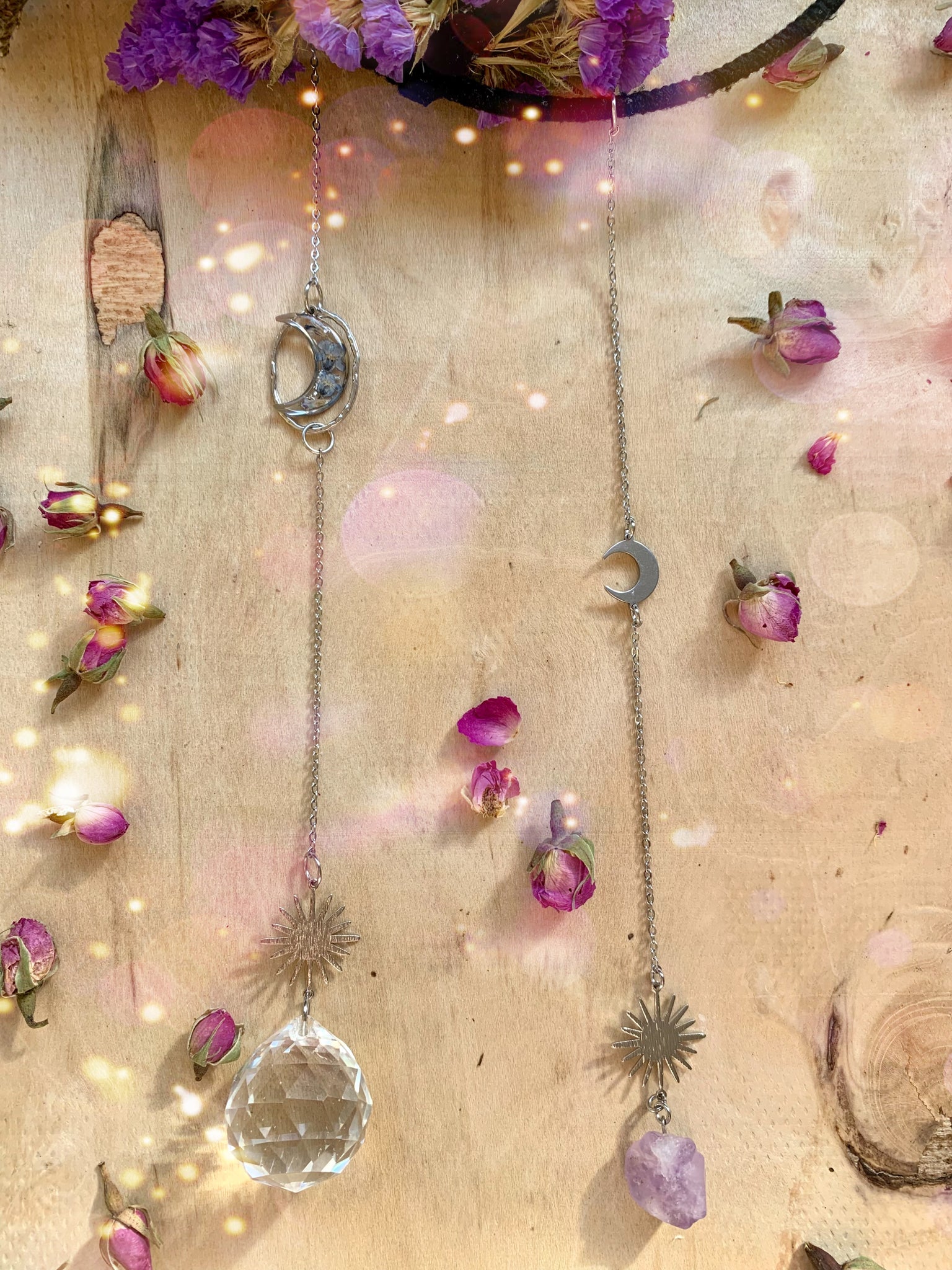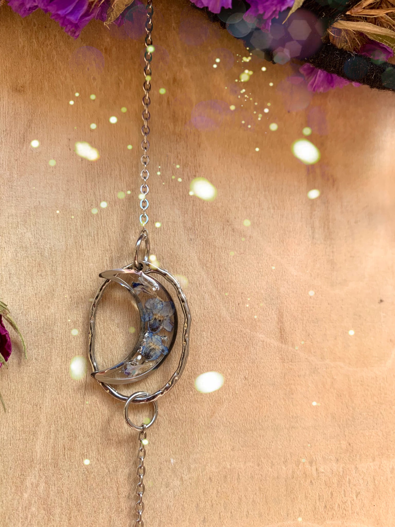 Real hand dried flowers and a handmade preserved Forget me not and wild flower charm. Stunning healing Amethyst crystals and light reflecting glass crystal set on a moon frame.