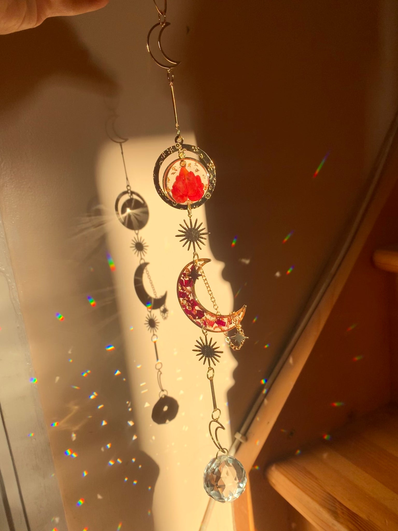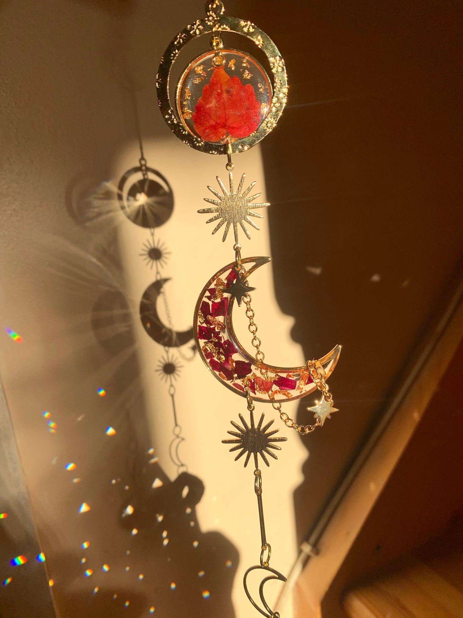 Real preserved Roses and autumn leaf grown from the Bosca Bandia garden, set in resin with gold leaf and gold plated charms. Light reflecting glass crystal ball.