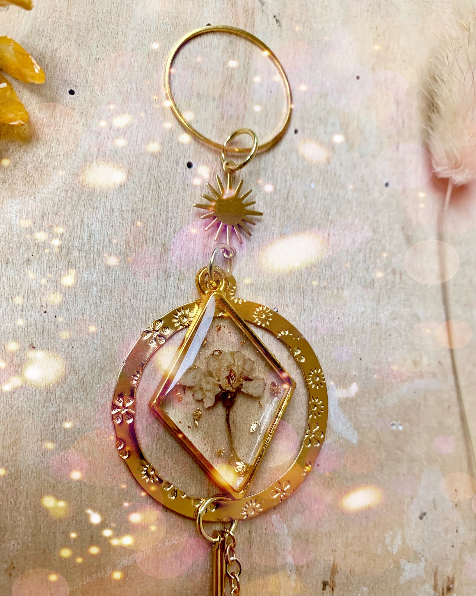 Real preserved spring miniature daffodil flower and blossom charm, tumbled Angel Aura Quartz crystals set in a moon Bezel, chains, charms and rainbow reflecting orb.