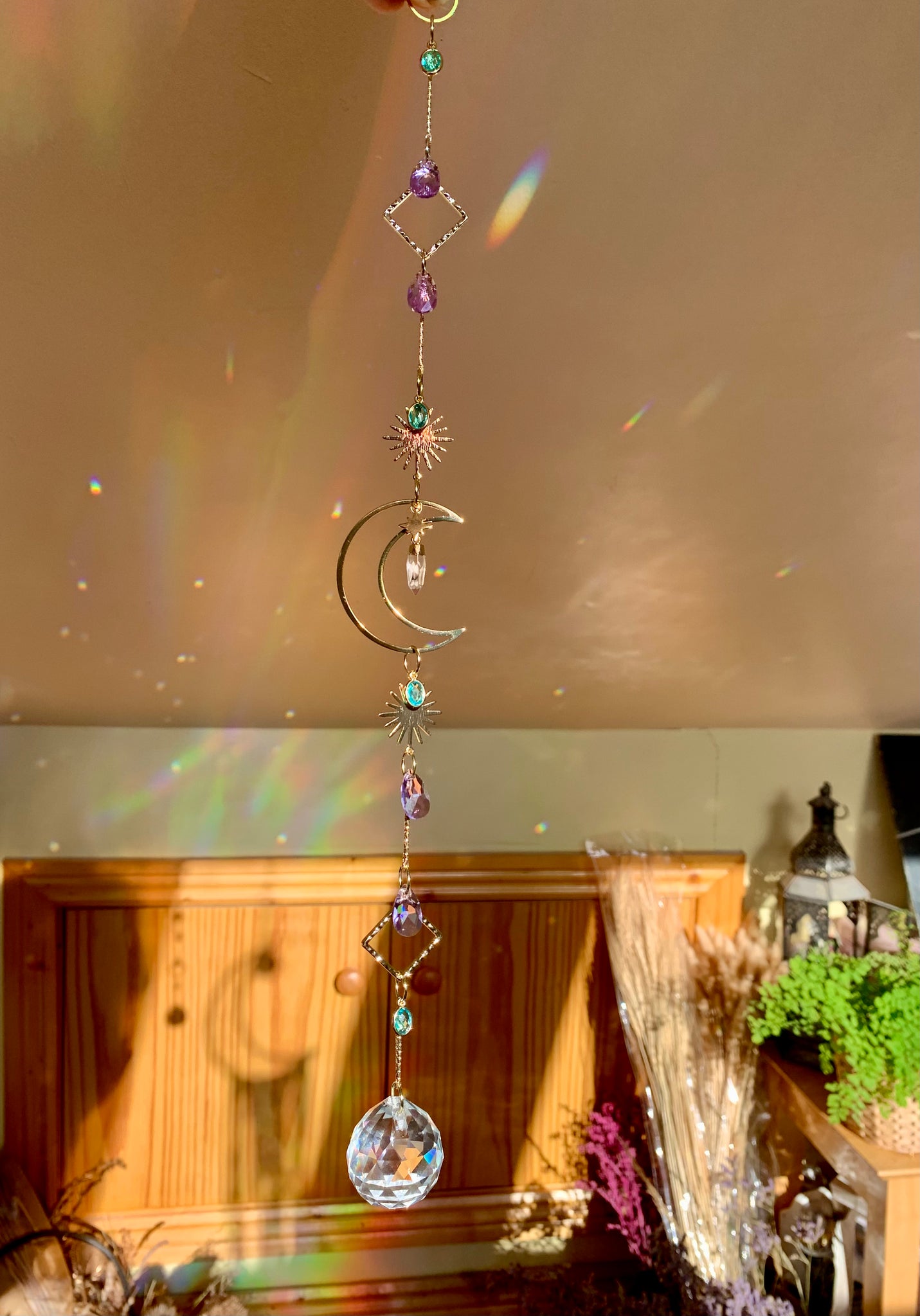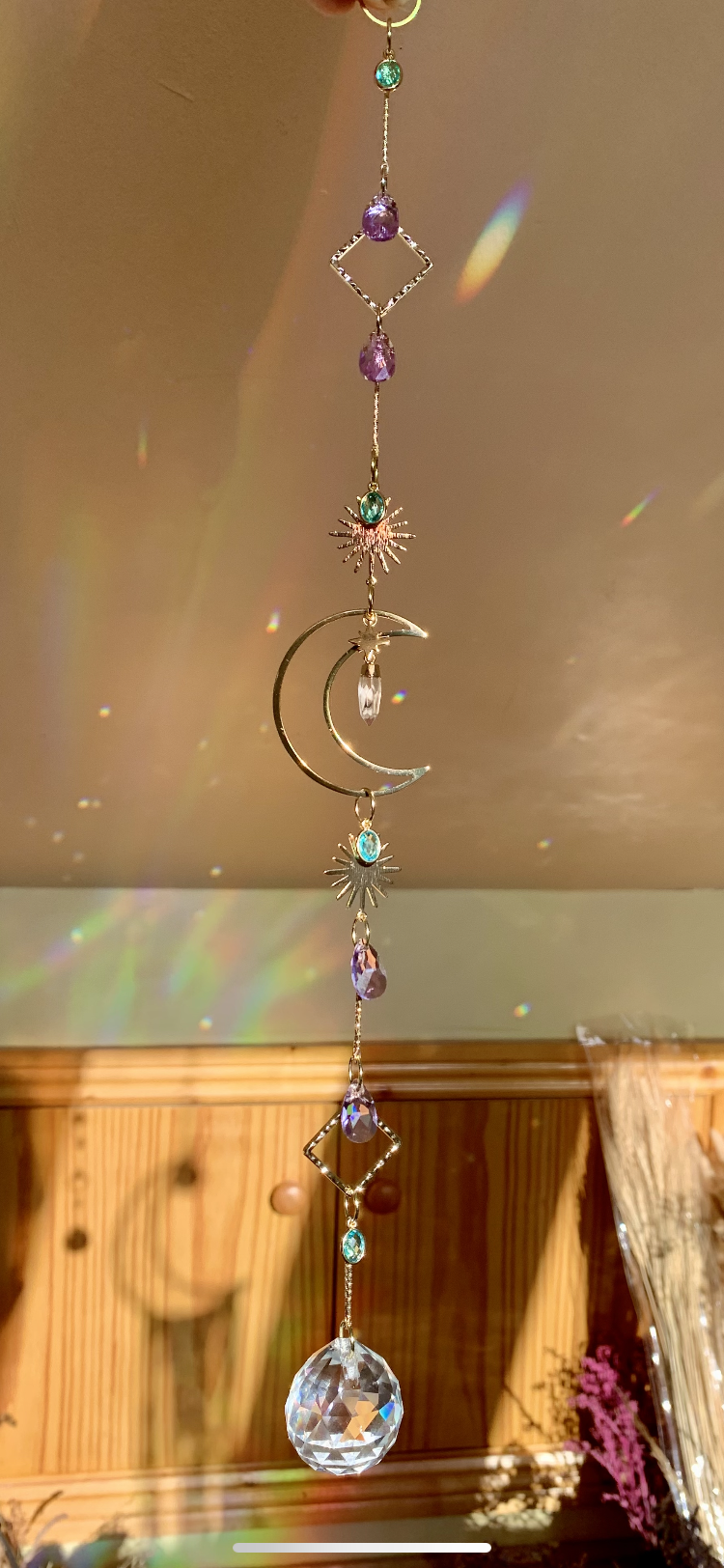 Sky blue, clear crystal Quartz and purple glass gems with a gold plated moon charm and crystal light reflecting orb