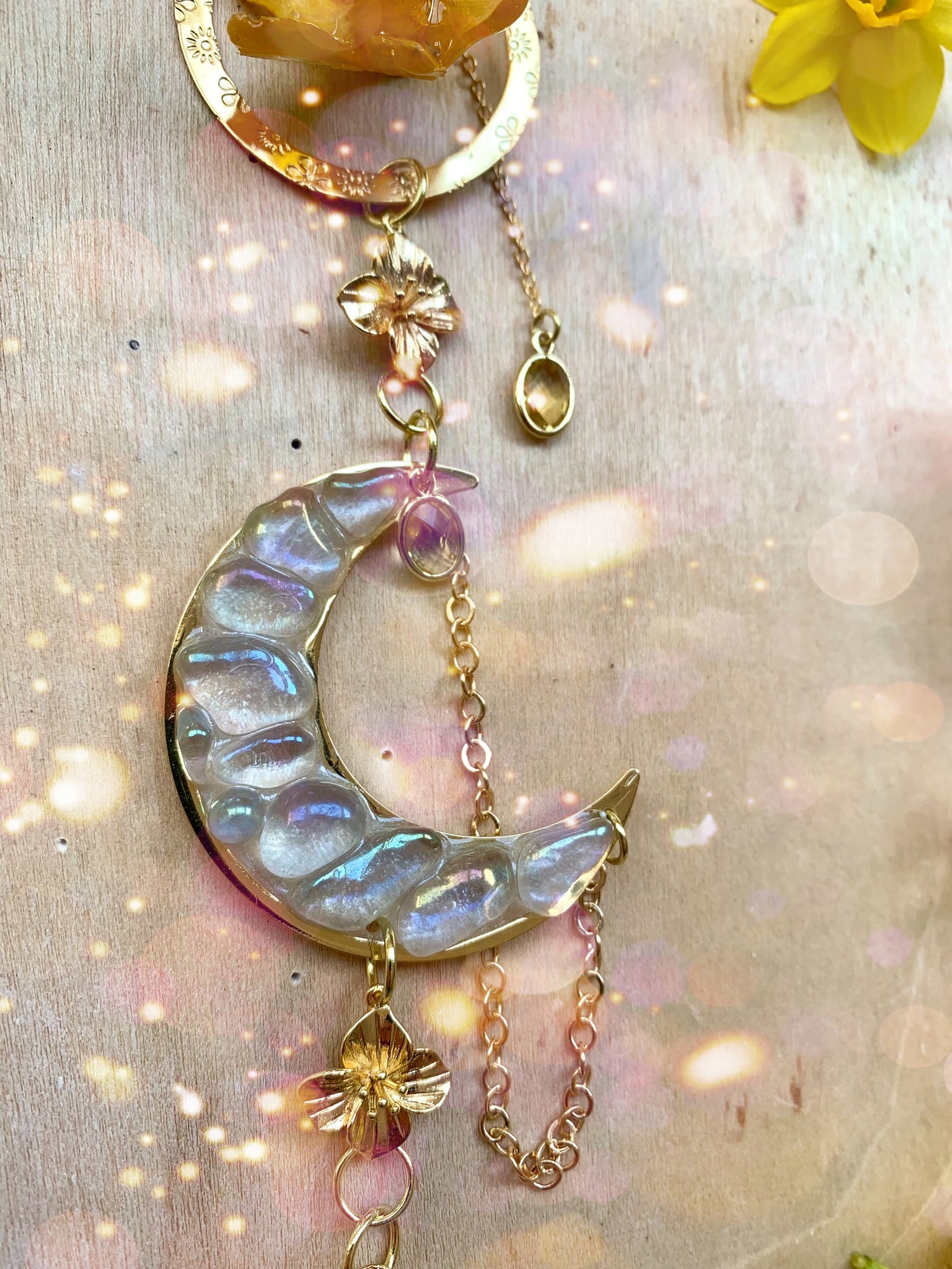 Real preserved spring miniature daffodil flower, tumbled Aura Quartz crystals set in a moon Bezel with a large Quartz crystal, chains, charms and crystal reflecting orb.