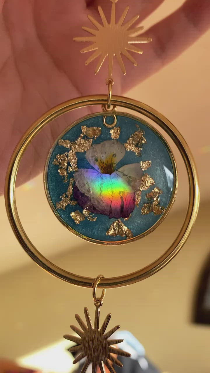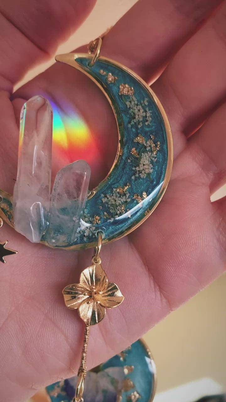 Real hand picked Queen Anne’s lace and Viola flowers preserved in gold leaf and shimmering blue resin with quartz crystals and gold plated charms.