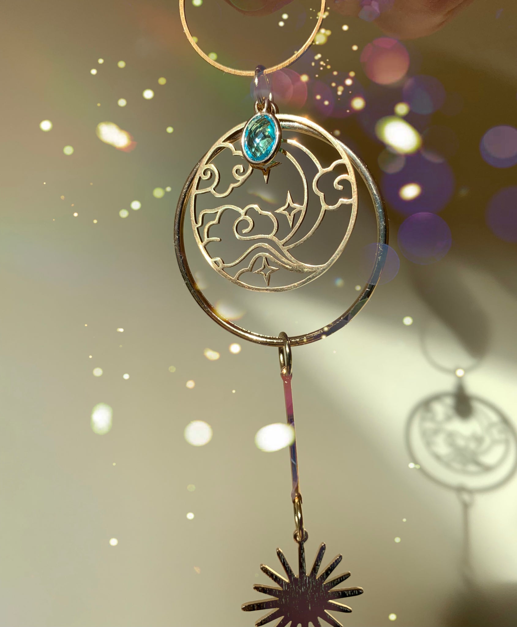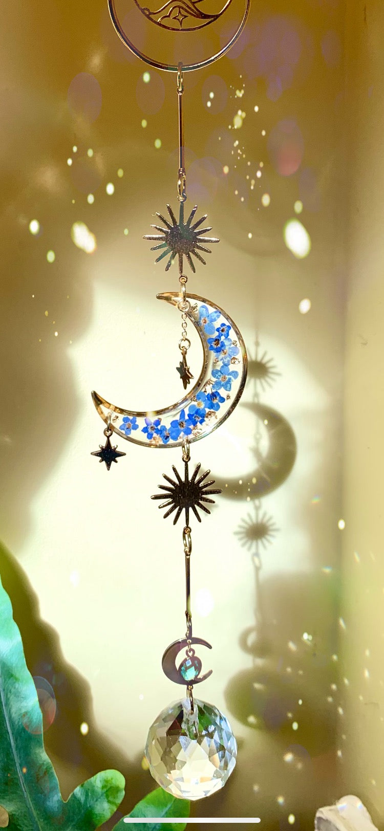 Gold plated moon pendant with real preserved Irish Forget me not flowers and a golden stainless steel sky scene.