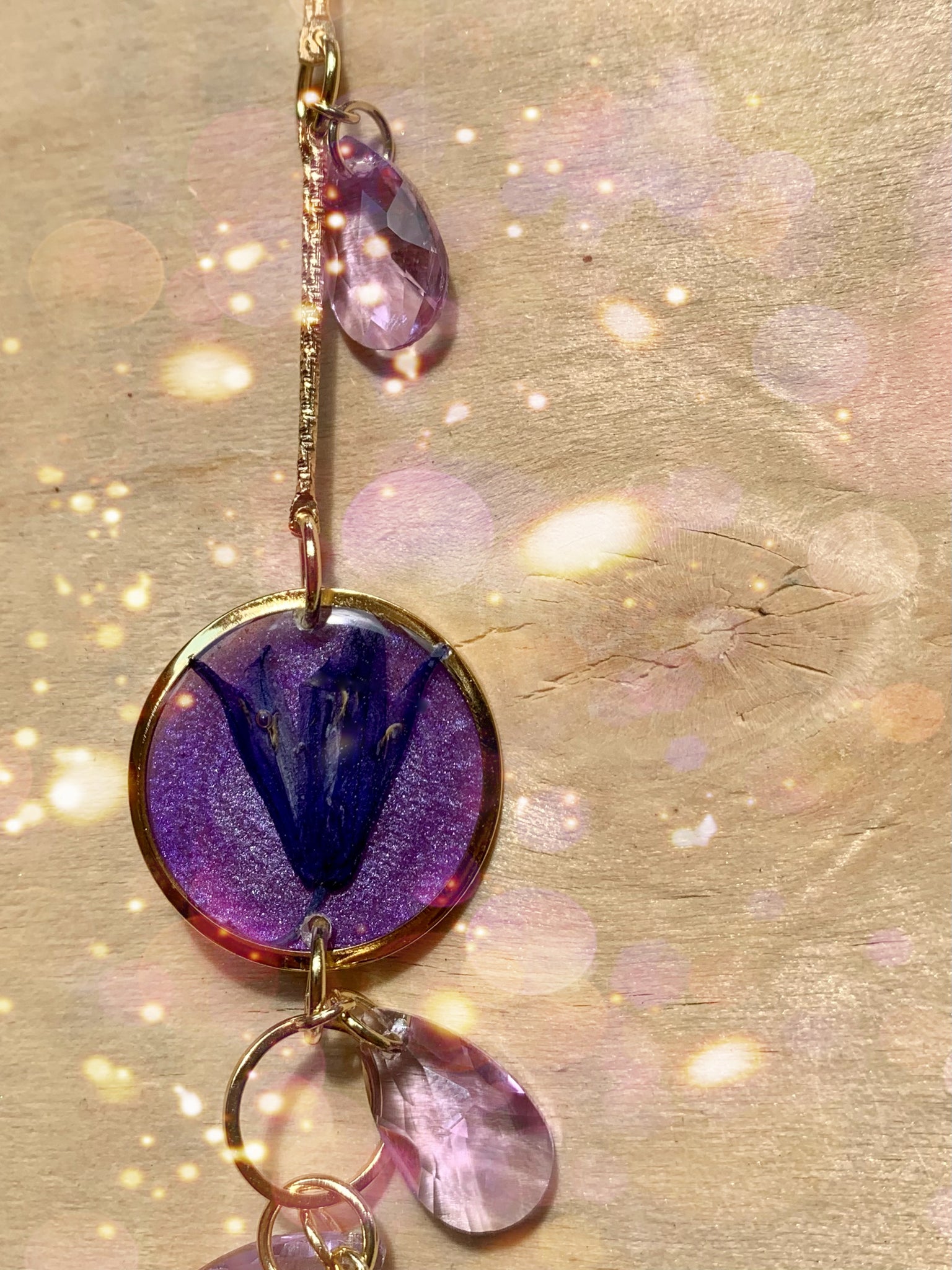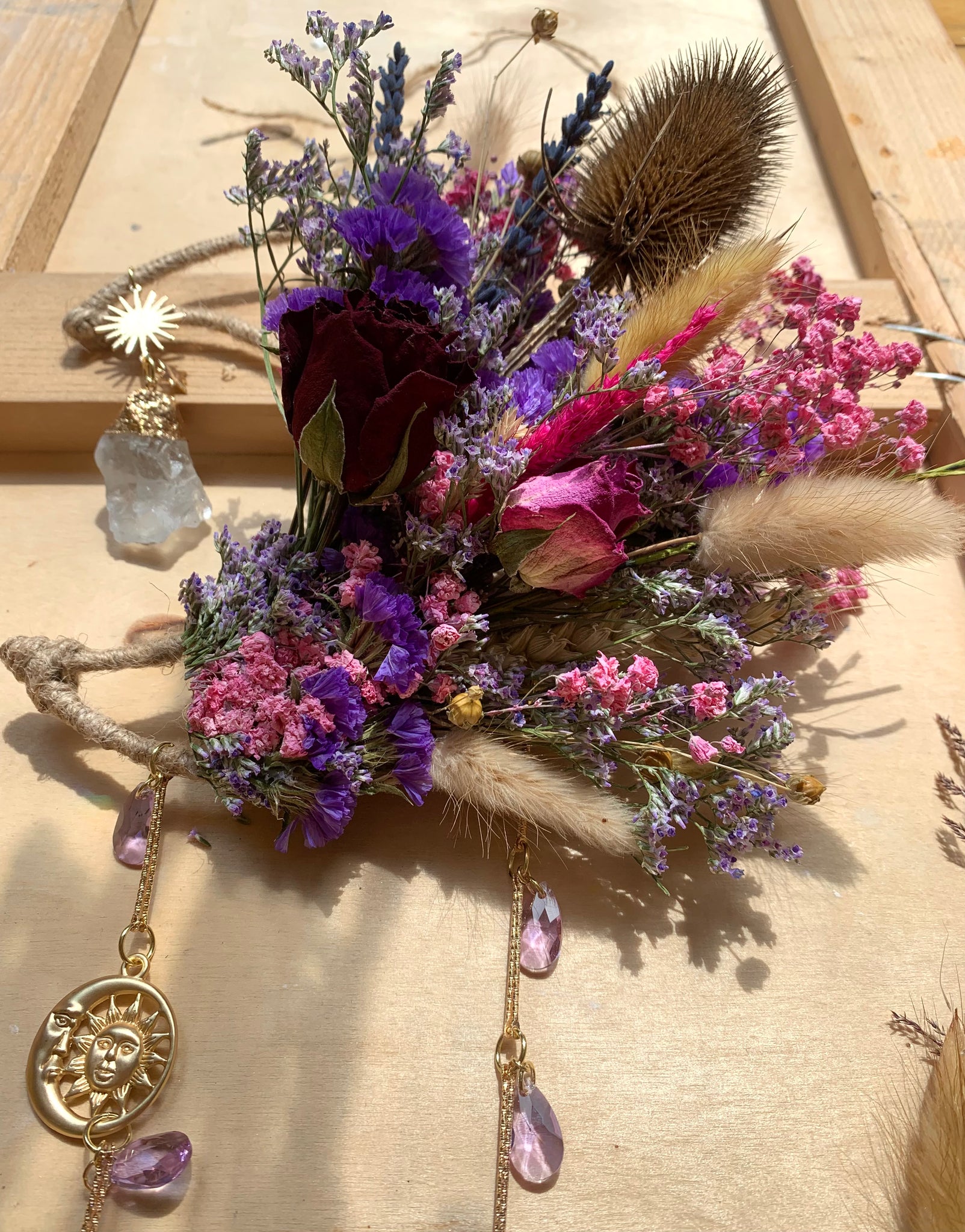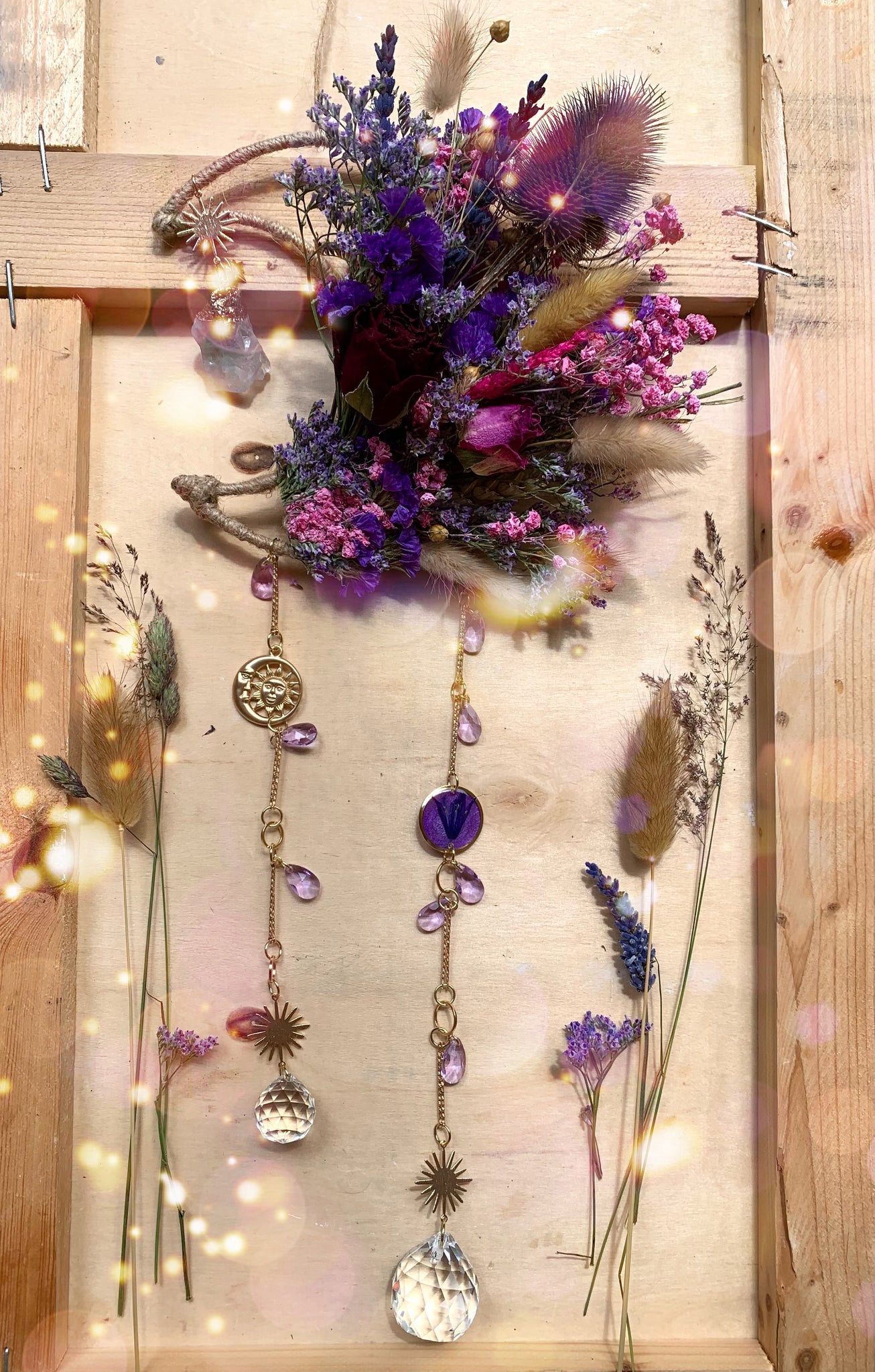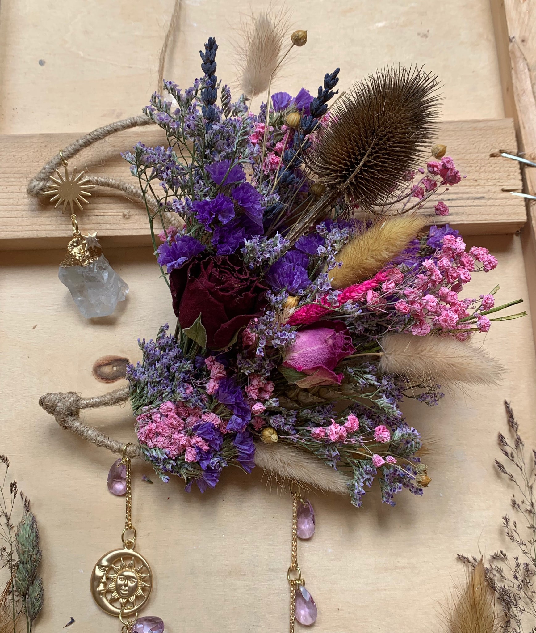 Real hand dried flowers and a handmade preserved Bluebell charm. Stunning healing Large rainbow fluorite crystal and light reflecting glass crystal set on a moon frame.