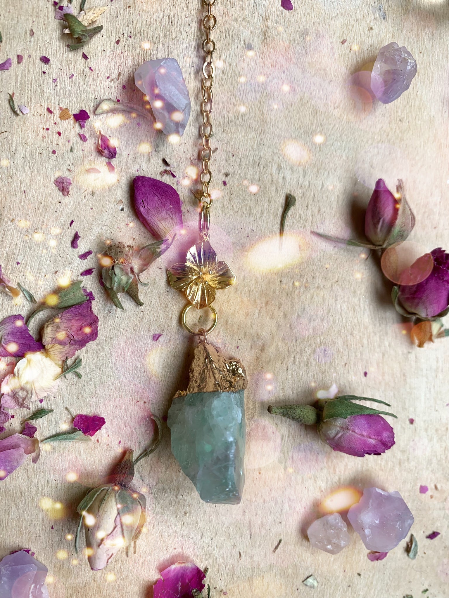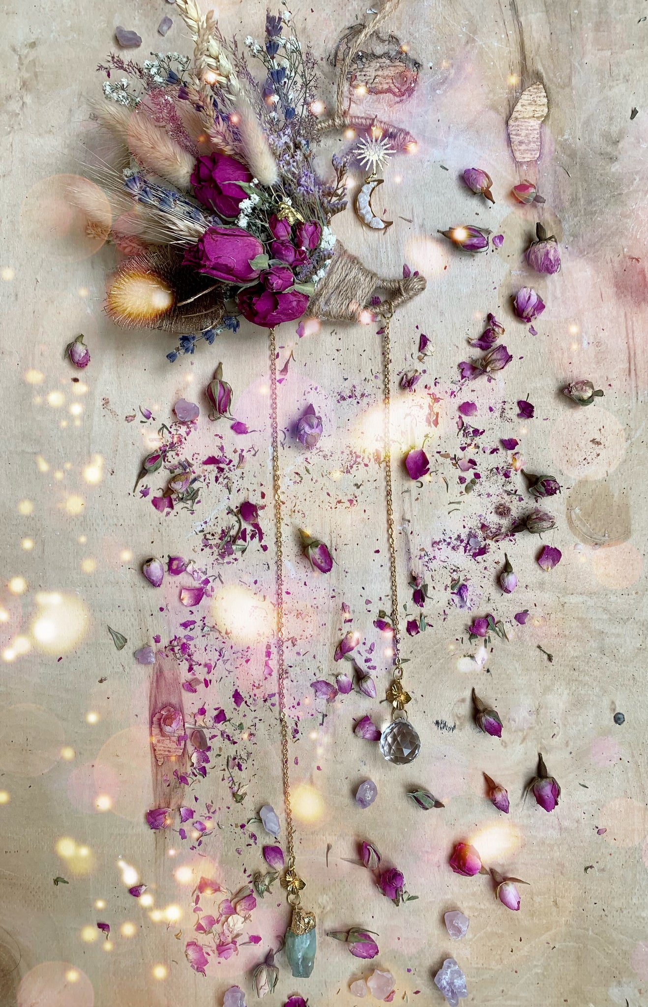 Real hand dried flowers and Angel Quartz crystal moon charm. Stunning healing Large rainbow fluorite crystal and light reflecting glass crystal set on a moon frame.