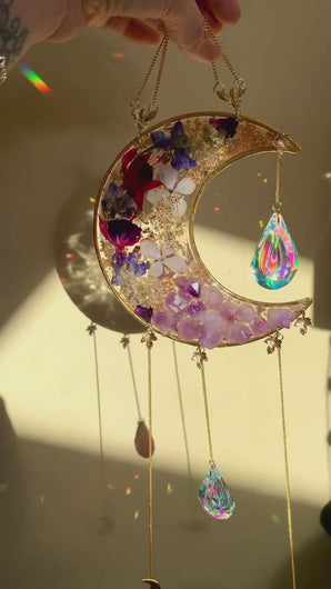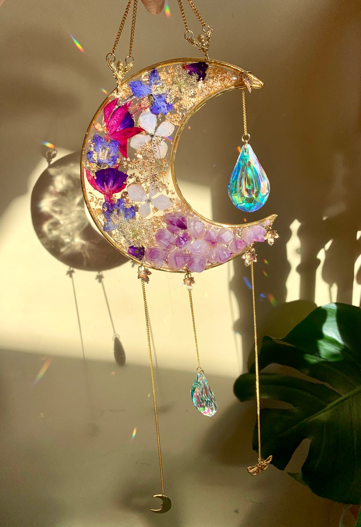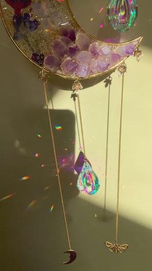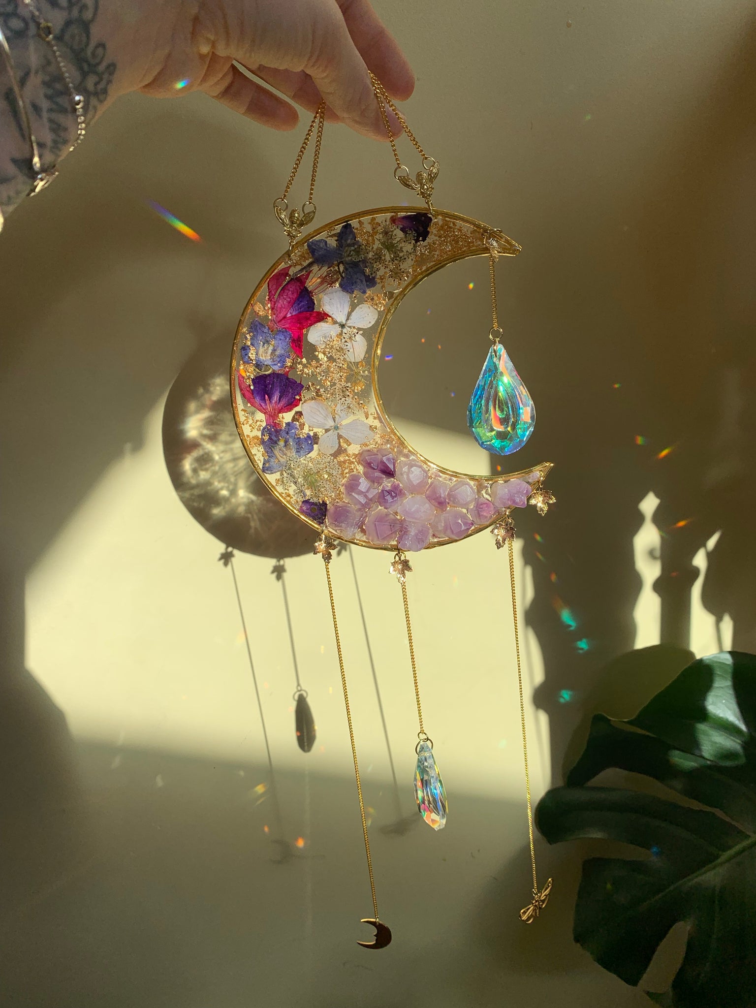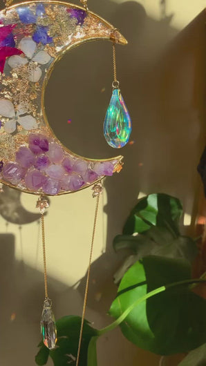 A moon filled with stunning amethyst crystals and real persevered flowers in gold leaf resin. All the beautiful flowers were handpicked on warm summer days in Wicklow Ireland.