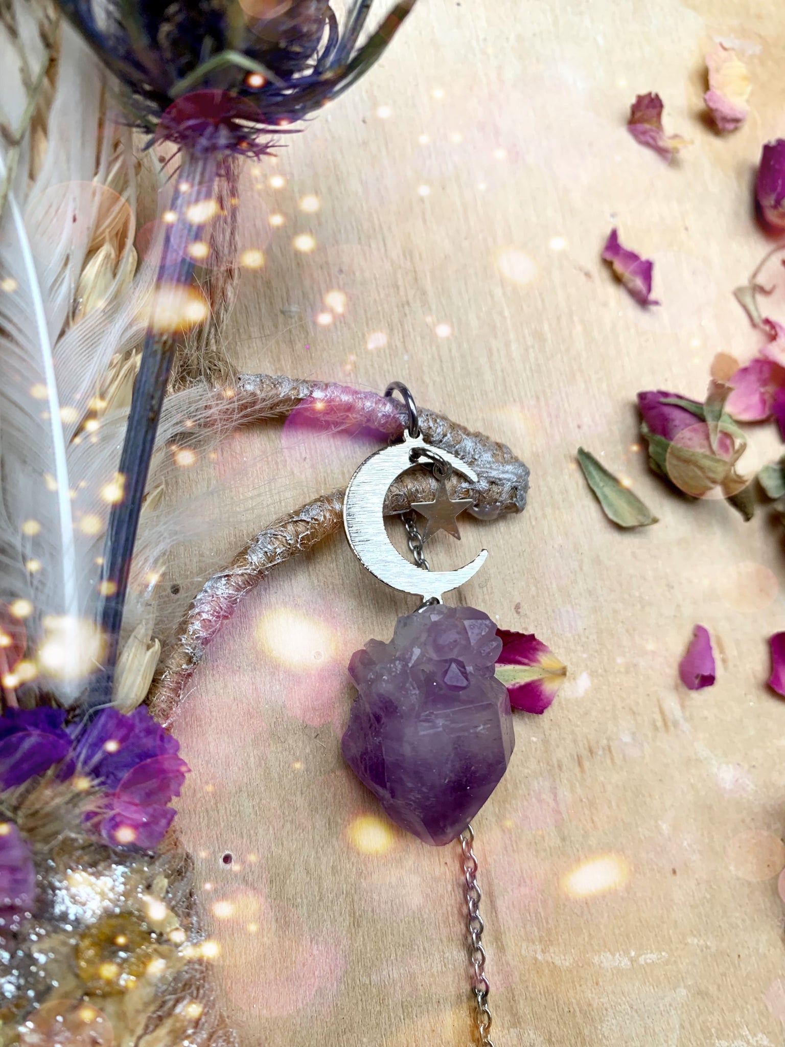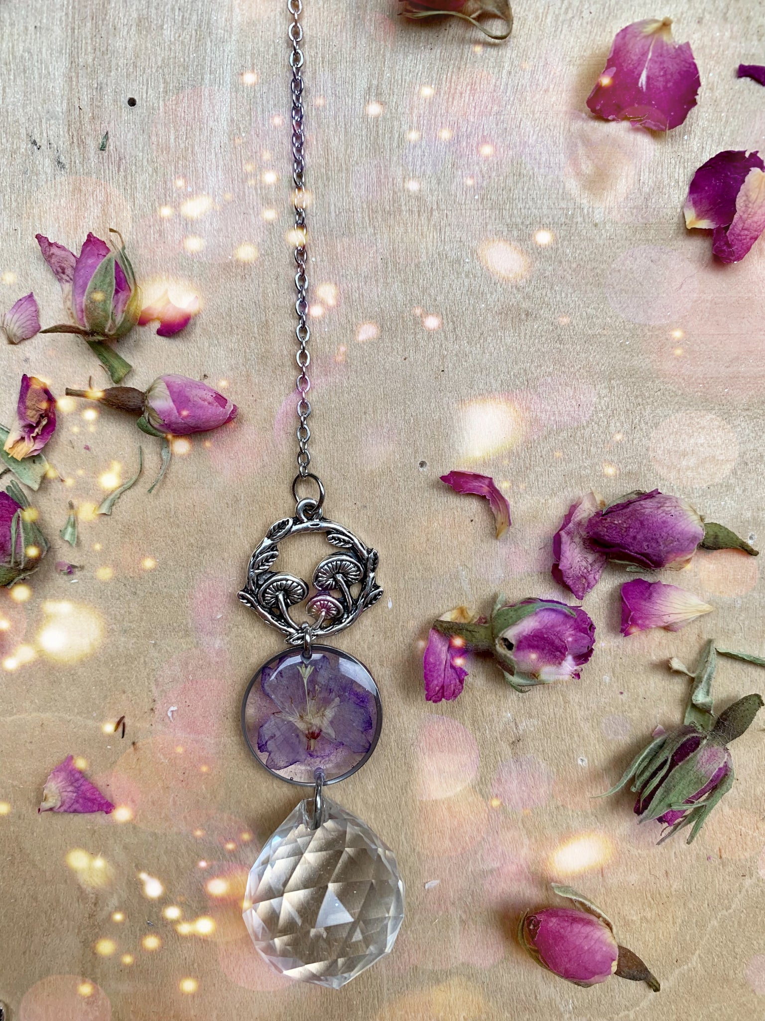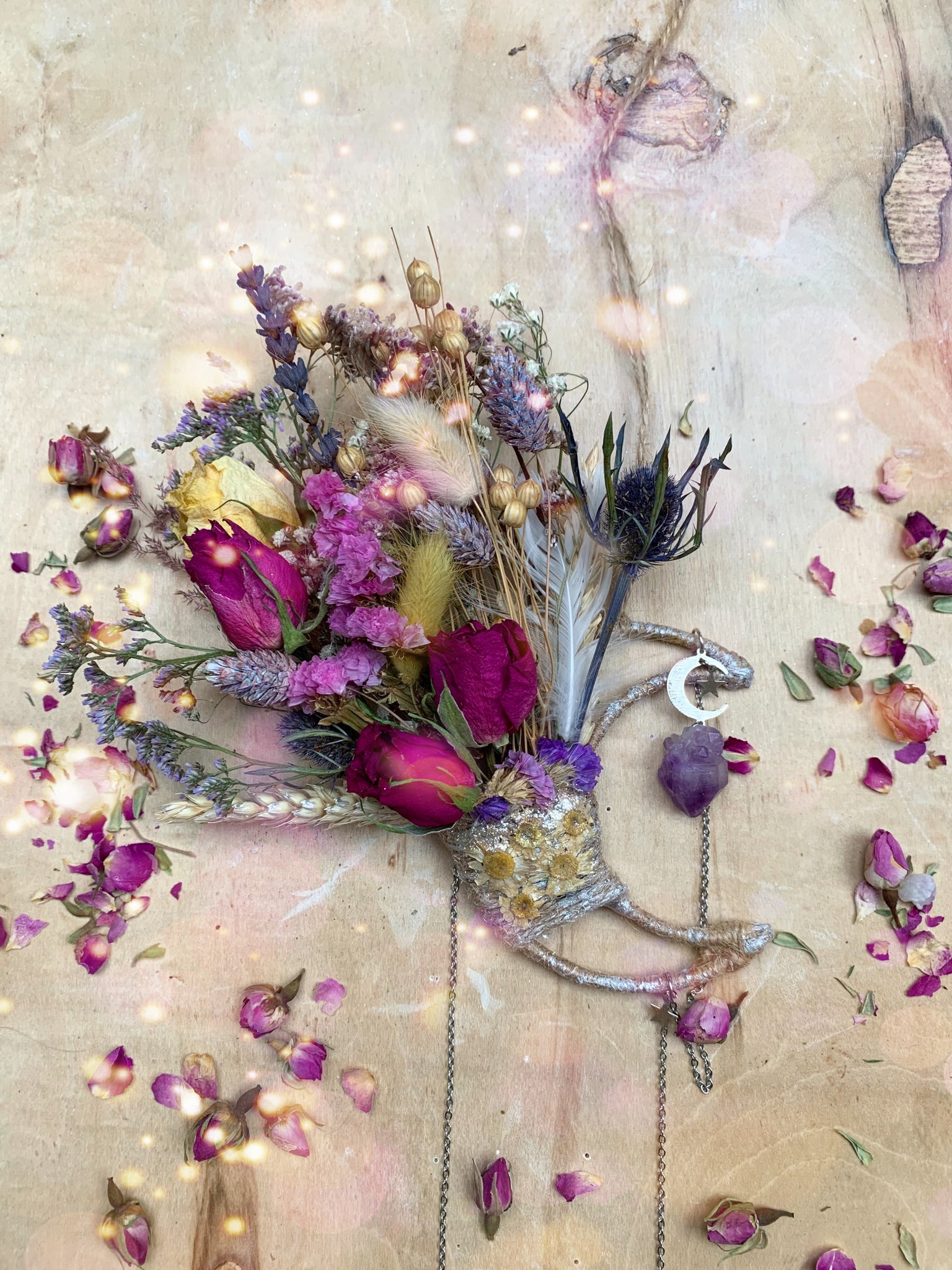 Real hand dried flowers and a handmade preserved flower charm. Stunning healing Amethyst crystals and light reflecting glass crystal set on a moon frame.