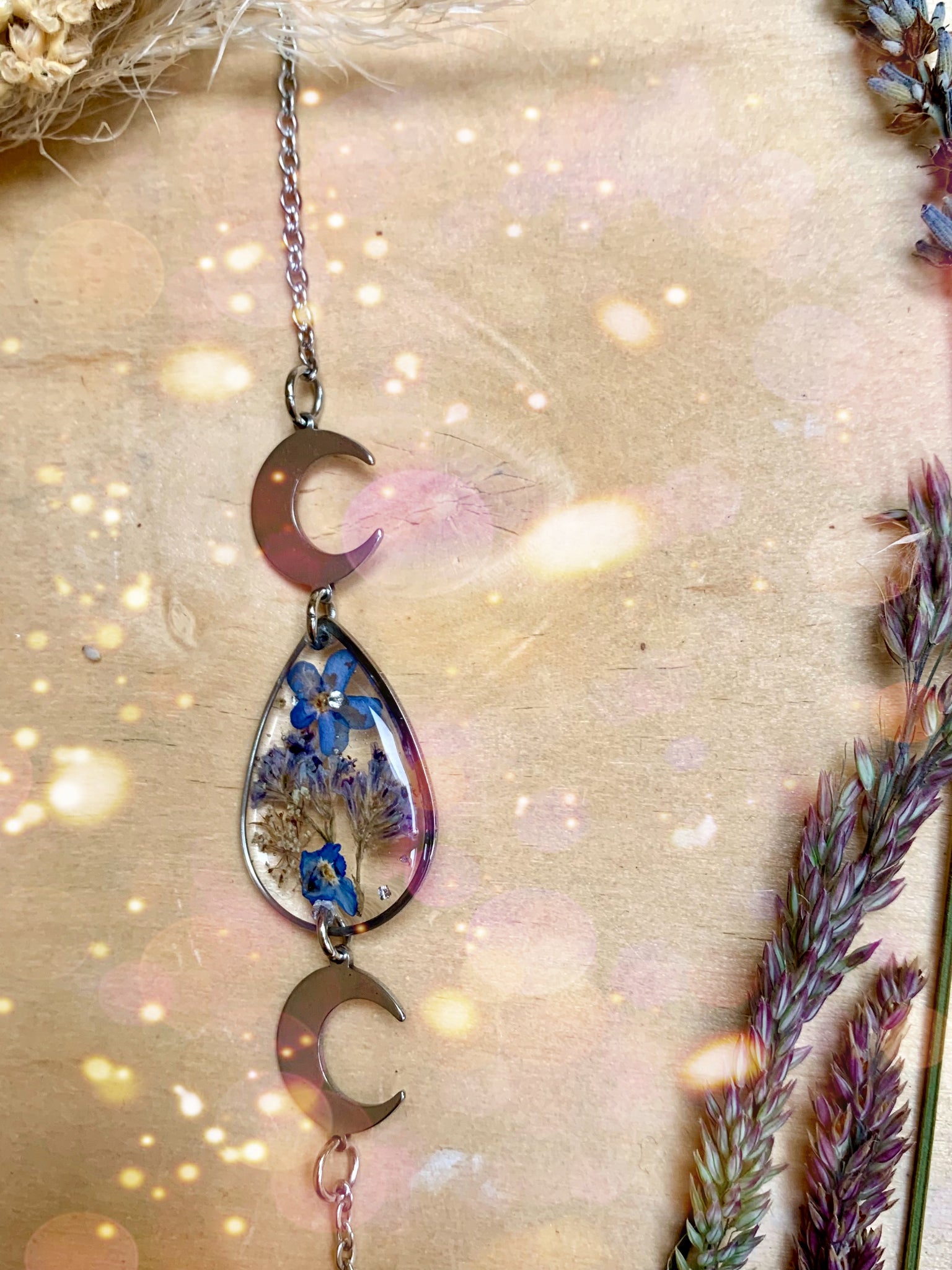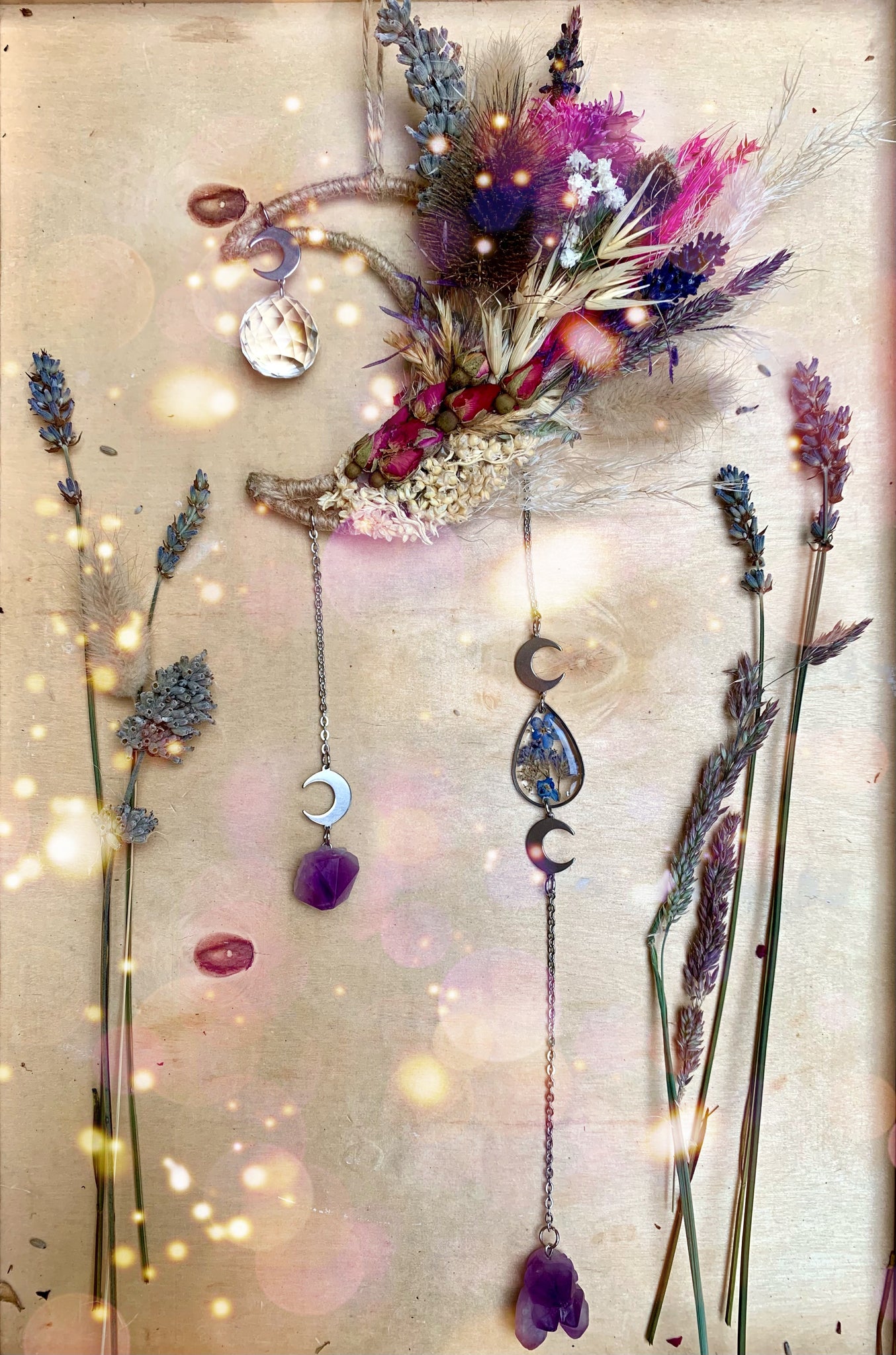 Real hand dried flowers, a preserved forget me, wild flower charm and local teasel. Stunning healing Rainbow Fluorite crystals and light reflecting glass crystals set on a moon frame.