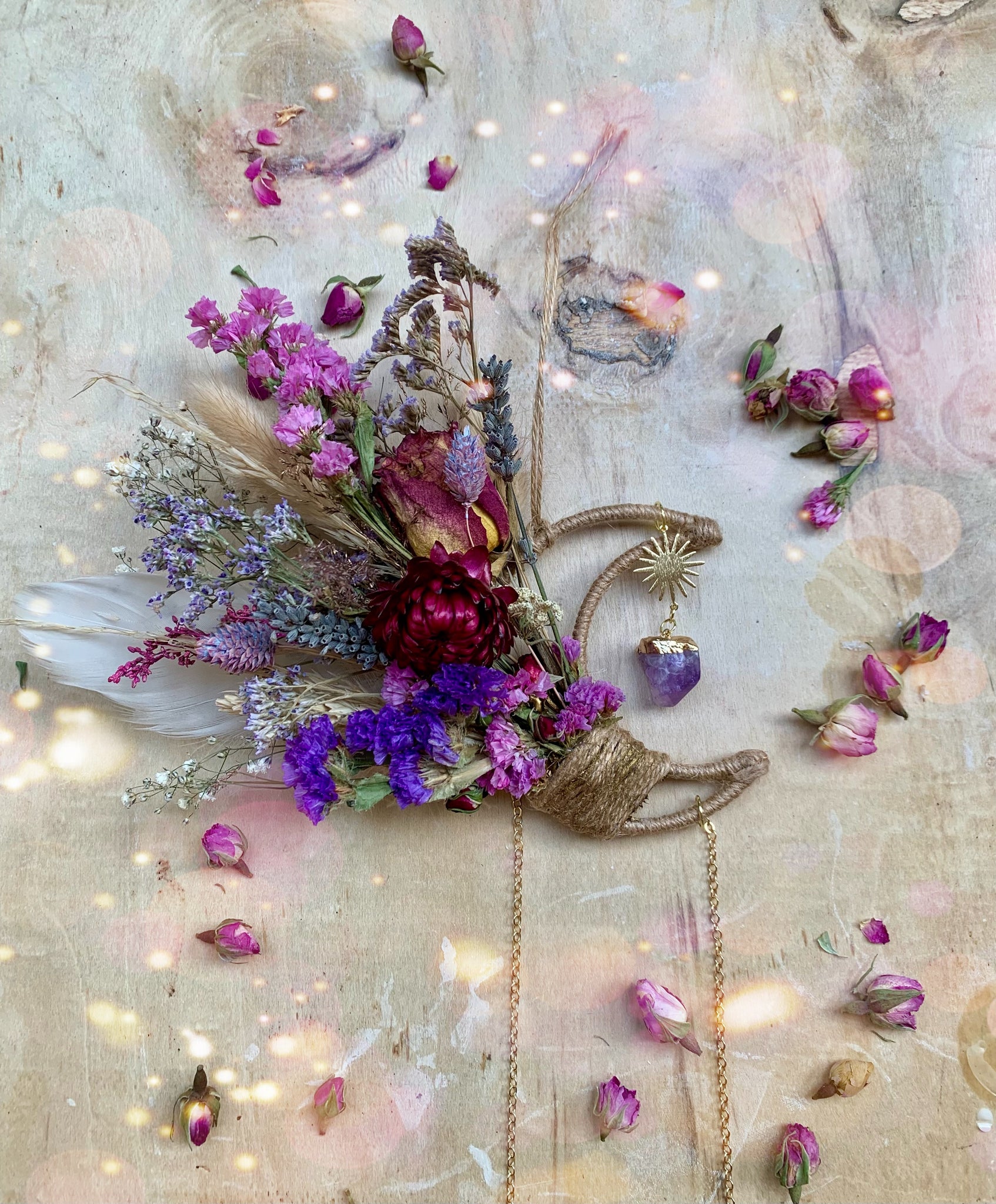 Real hand dried flowers with beautiful healing amethyst crystal and light reflecting glass crystals set on a moon frame.